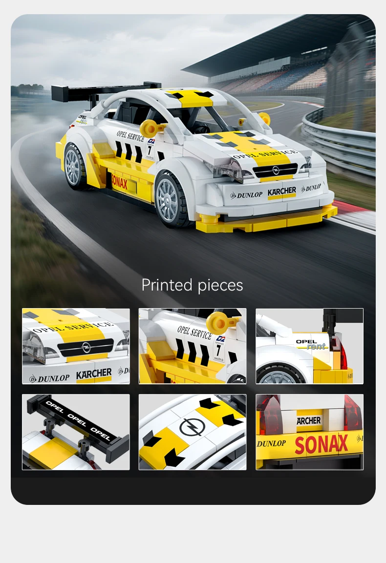 Experience the thrill of racing with this detailed Opel rally car building set by CaDA. Crafted from high-quality ABS plastic, this 1:24 scale model captures the sleek, aerodynamic design of a real rally car. Its glossy white finish is accented with vibrant yellow highlights on the side mirrors and front bumper, mimicking the dynamic look of the actual vehicle. The set includes tiny, self-locking bricks that allow you to assemble a highly realistic replica featuring sponsor decals such as “OPEL SERVICE” and “SONAX,” along with a prominent rear wing and front splitter. Whether you're a seasoned builder or a passionate enthusiast, you'll enjoy recreating this high-performance vehicle, perfect for display or active play.