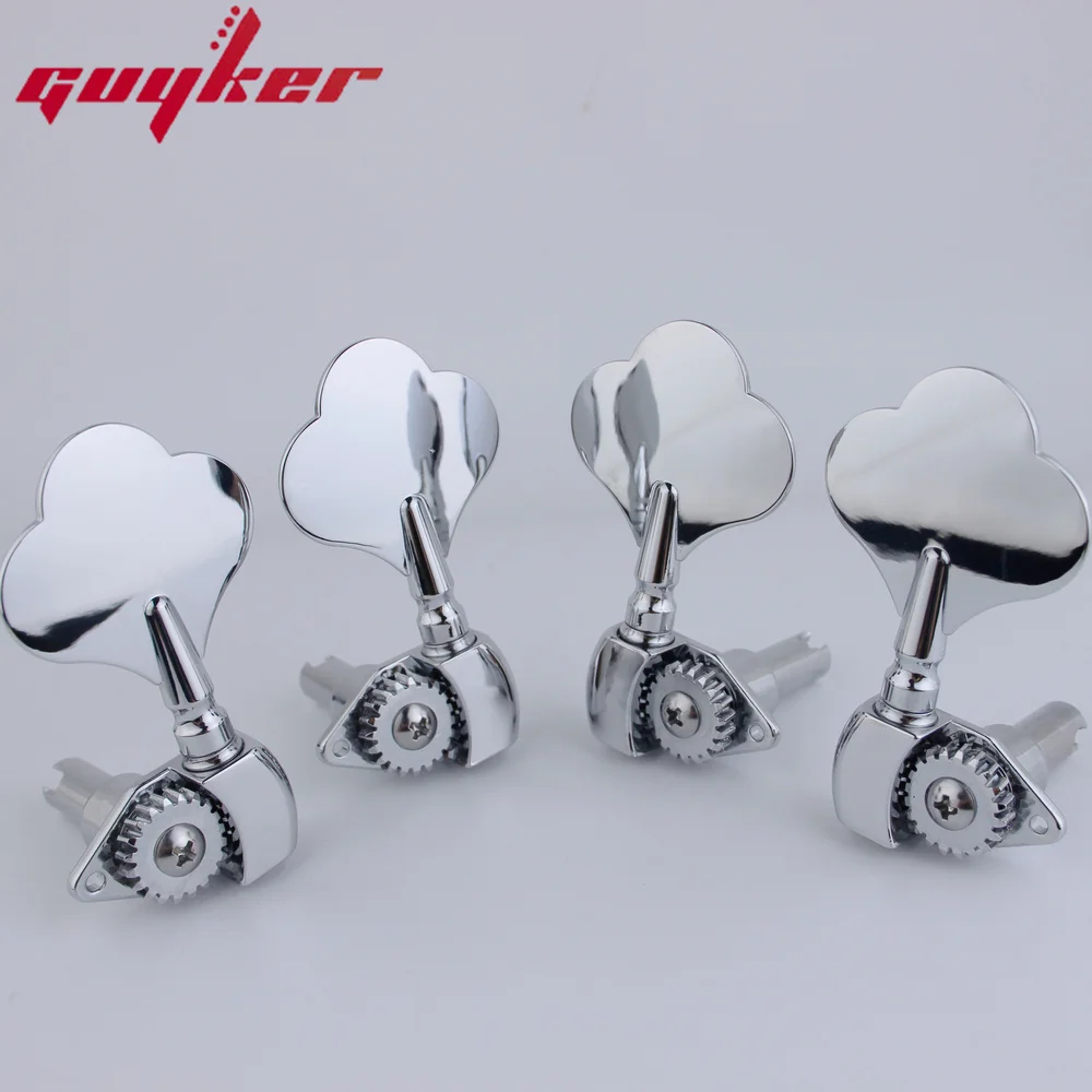 Experience the perfect blend of modern design and precision with these open frame electric bass tuners. Crafted from durable metal with a shiny, chrome finish, they showcase a sleek, high-end aesthetic. The exposed gear mechanisms reveal intricate circular, serrated gears, emphasizing craftsmanship and functionality. The stylized quatrefoil or cloverleaf tuning pegs add a touch of elegance, making these tuners not only durable but visually appealing. Available in multiple color options—2R2L, 3R2L, 4L, and 4R—these machine heads are designed for easy installation and reliable performance. Whether replacing worn-out tuners or upgrading your instrument’s look, these tuners deliver both style and precision, making your bass guitar stand out. They offer a minimalist yet sophisticated appearance that highlights quality craftsmanship.