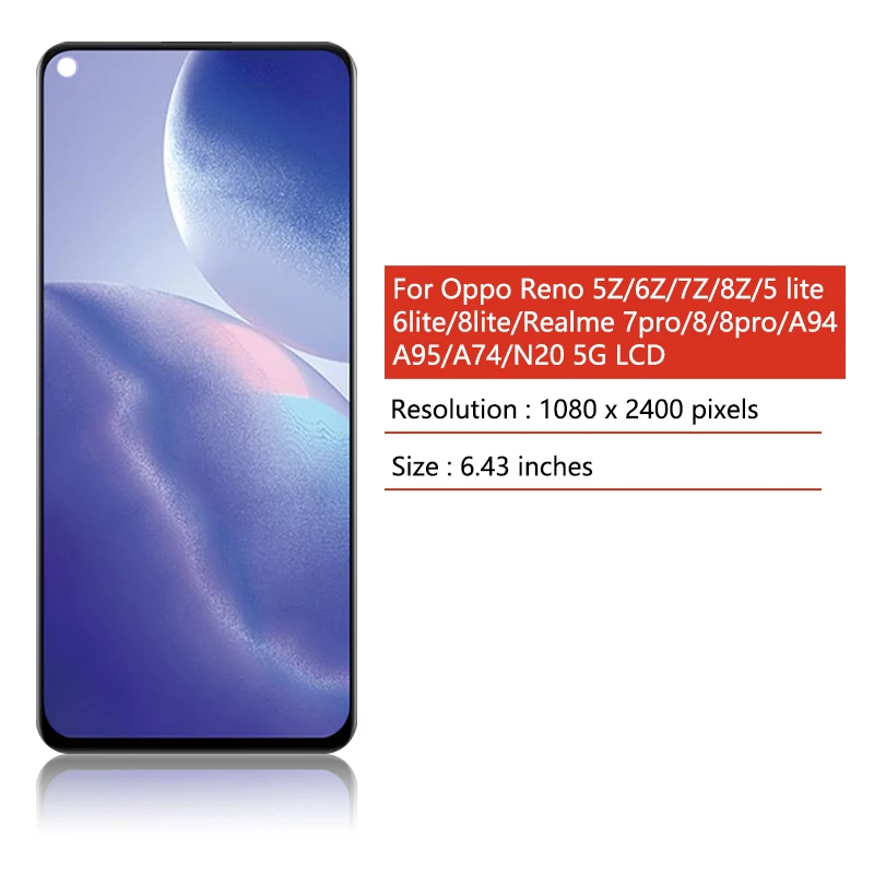 Enhance your device’s functionality and appearance with this high-quality 6.43-inch LCD touch screen replacement, compatible with various Oppo Reno and Realme models. Carefully tested to ensure perfect performance, this incell TFT display features a 1080 x 2400 pixel resolution and a capacitive touch screen, providing crisp visuals and smooth interaction. Pre-activated with a protective film, it offers a secure and easy installation process. Ideal for replacing damaged, cracked, or malfunctioning screens, this reliable LCD kit ensures your device looks and functions like new. Trust our extensive inventory and dedicated customer support for a seamless experience from purchase to installation.