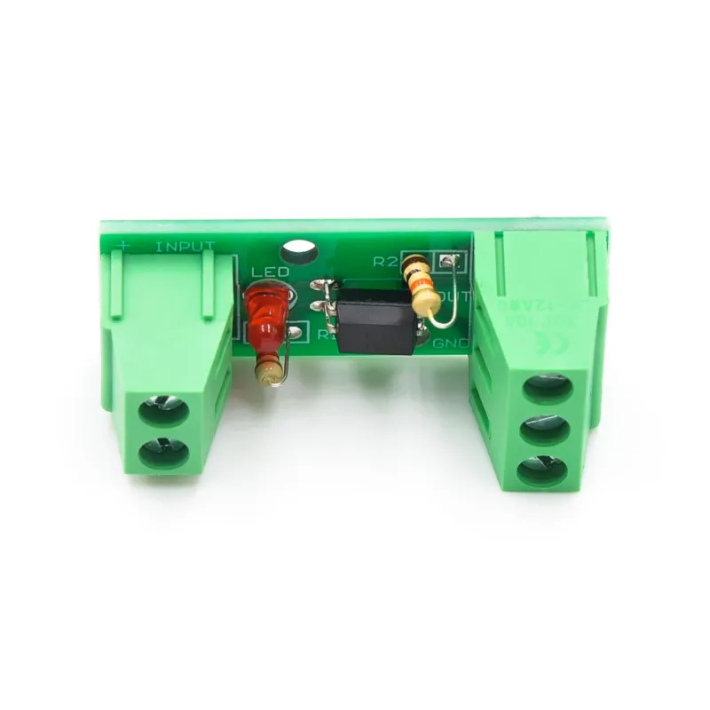 Experience reliable signal isolation and amplification with this sleek, high-performance optical coupling module. Designed with a vibrant green PCB and sturdy terminal blocks, it offers an organized and durable setup that integrates effortlessly into your electronic systems. The black IC package serves as a focal point, emphasizing precision and quality. Bright red LED indicator ensures quick visual status checks, while resistors with colorful bands add subtle accents. Whether you need to protect your microcontroller, drive motors, or interface with PLC devices, this module provides a clear and sturdy solution that guarantees safety and stability. Its industrial aesthetic combines functional minimalism with technical finesse, making it as visually appealing as it is effective.