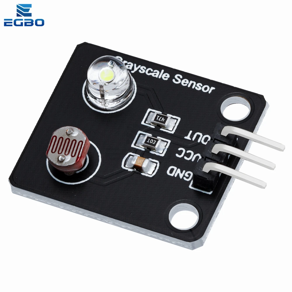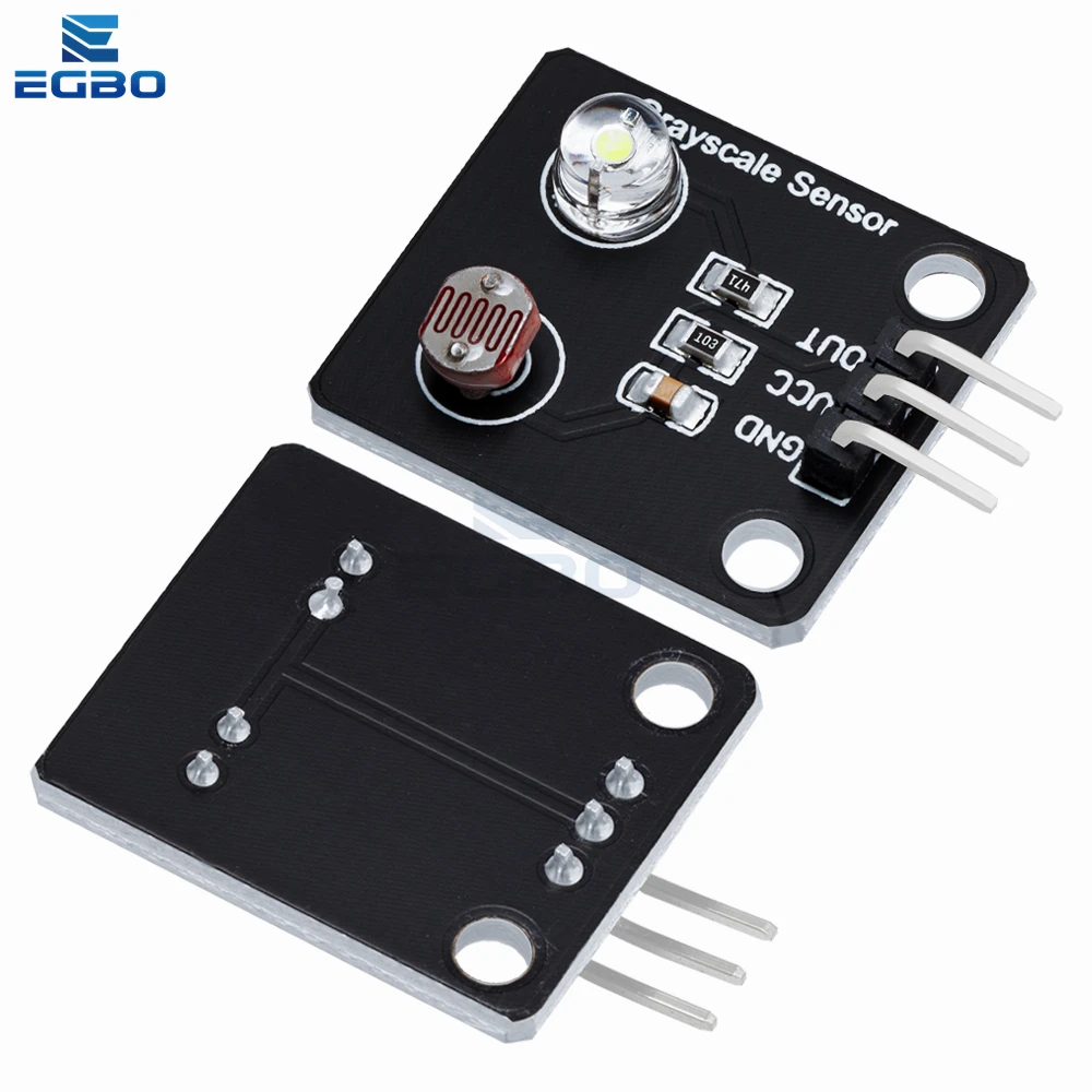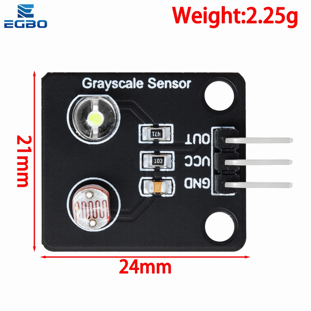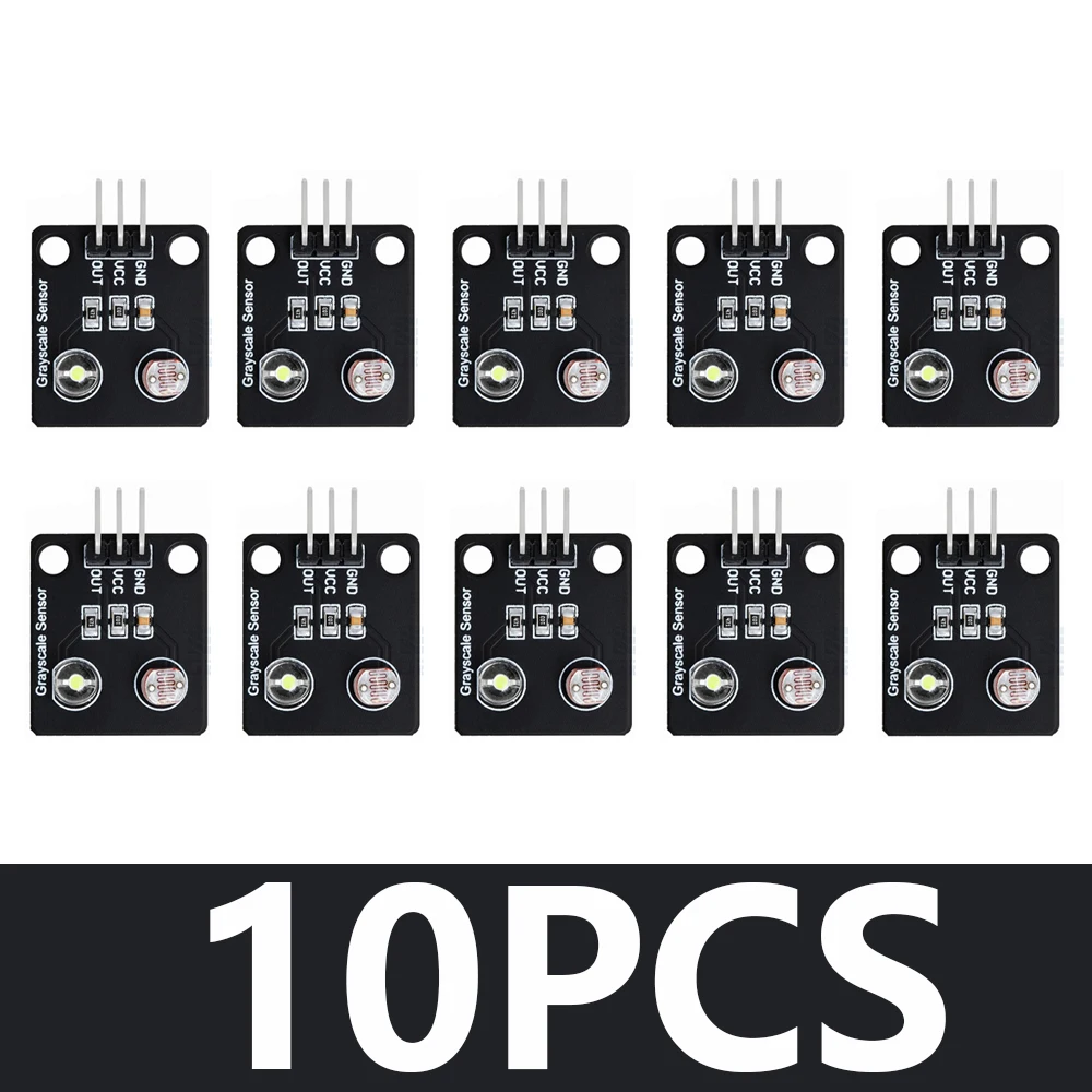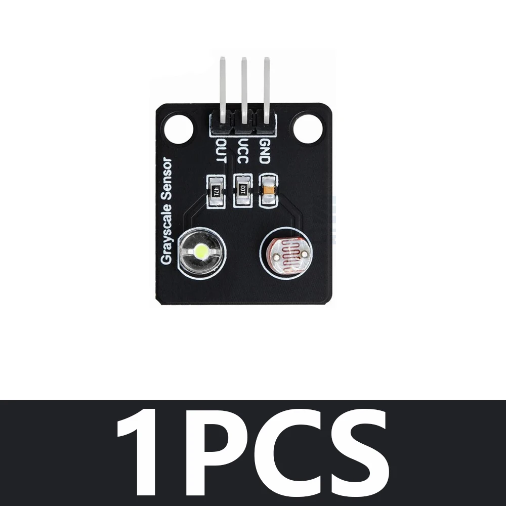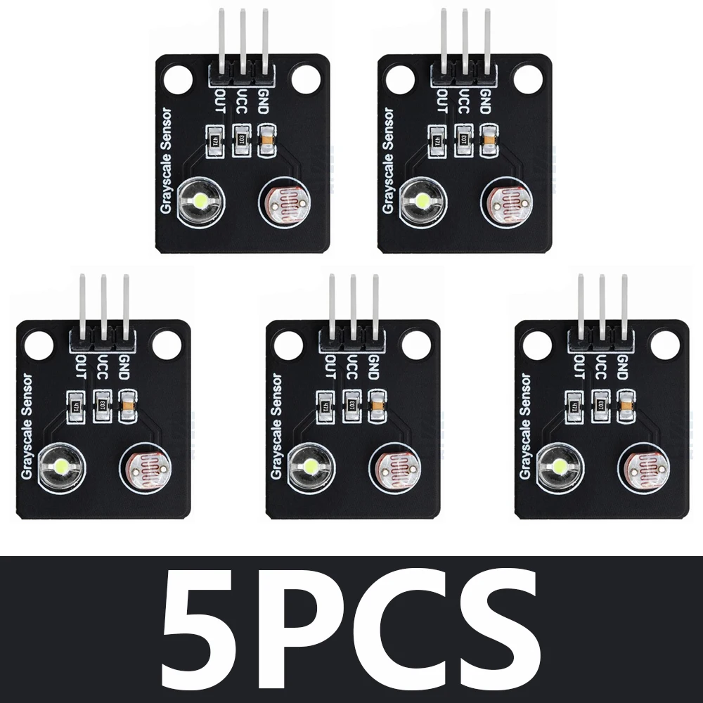 Experience precise light sensing with this compact optical sensor module measuring 24mm x 21mm x 9mm, featuring a sleek black square design. It functions as an analog grayscale detector with a switching transducer output, ideal for line detection and tracking applications. Made from durable polymer material, it seamlessly integrates into DIY and electronic projects. The module includes a white LED and a coil-patterned photosensitive element, with surface-mounted resistors and a three-pin header for easy connection to power (VCC, GND) and signal (OUT). Available in packs of 1, 5, or 10 pieces, this versatile sensor enhances your project’s accuracy and efficiency with its modern, minimalist aesthetic and reliable performance.