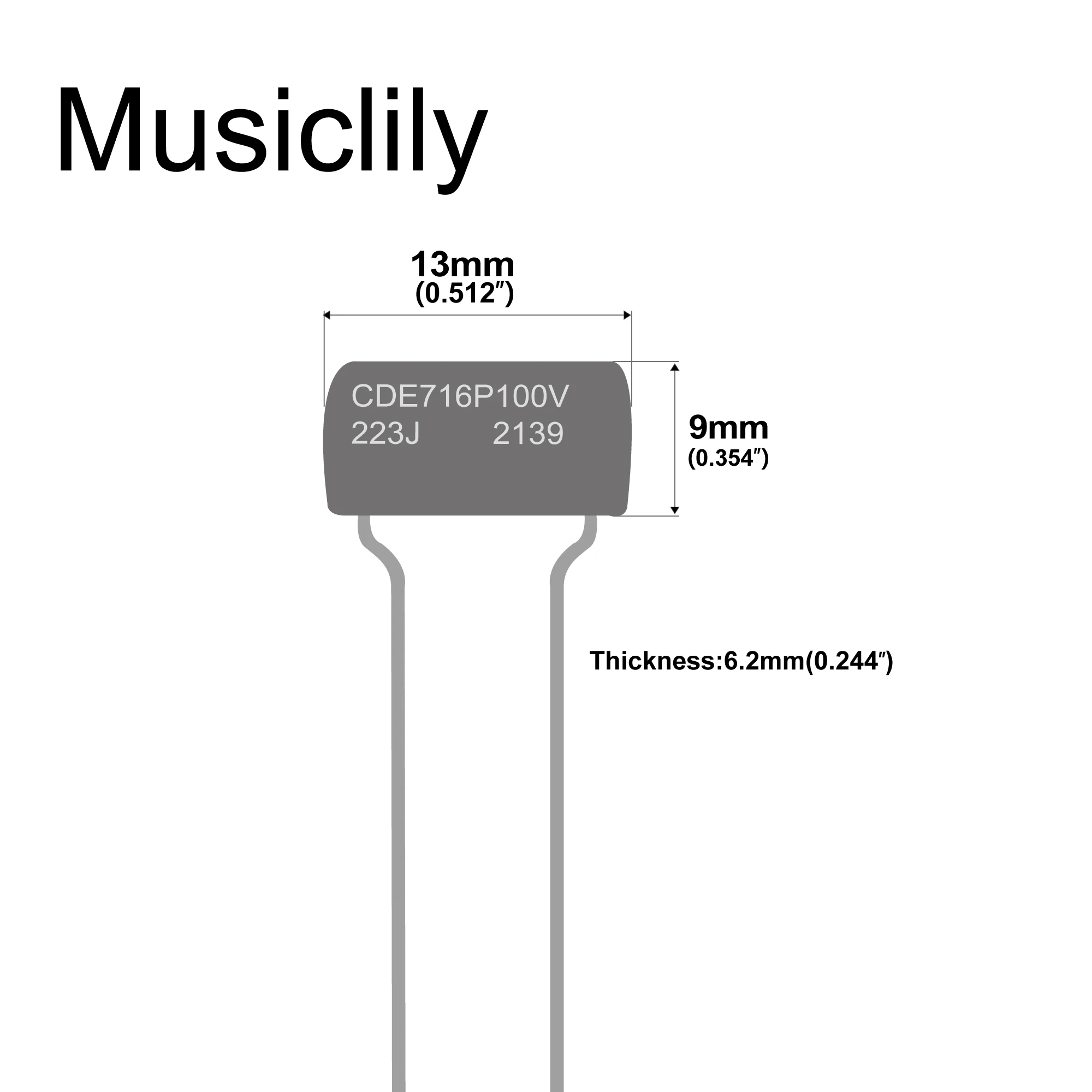 - The 0.022uF model measures 13mm long, 9mm wide, 6.2mm thick, designed for tight spaces in guitar or amp cavities.