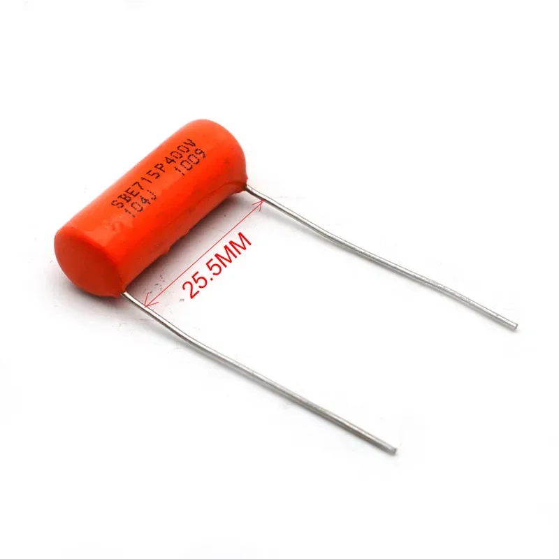 - Set of 10 polypropylene film capacitors with orange color, model SBE 715P/225P, rated at 0.1µF and 400V, ideal for precise tone control in electric guitars.