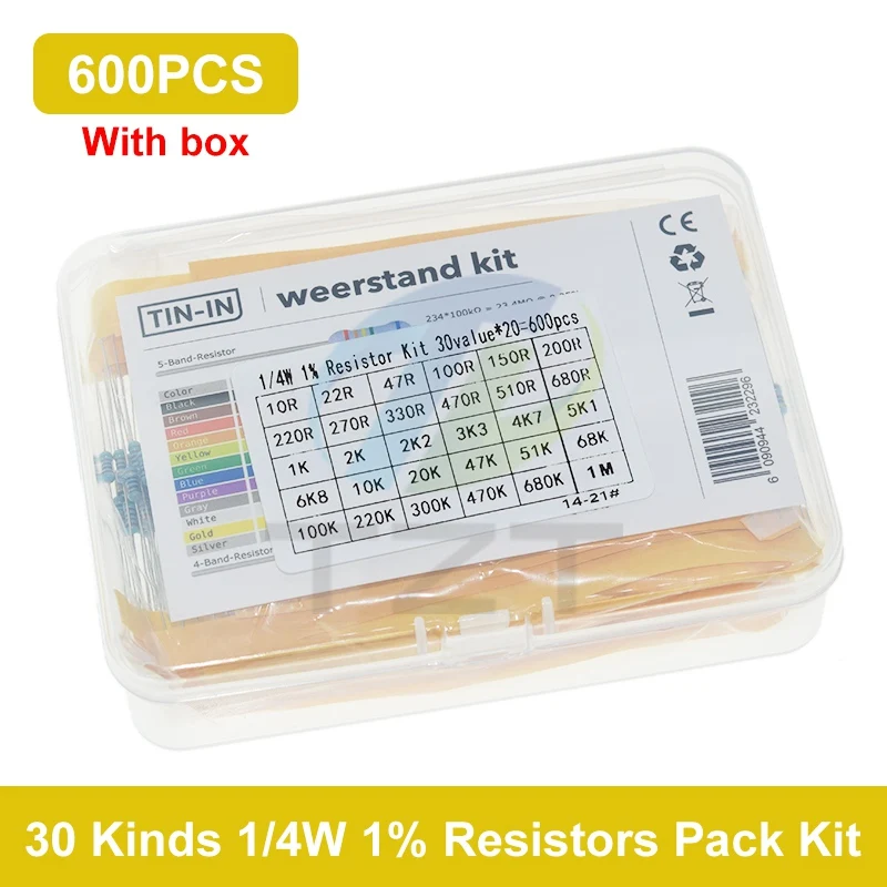 Experience the convenience of having a versatile resistor set at your fingertips with this organized kit. Featuring either 600 or 300 resistors spread across 30 different types, these 1/4W, 1% tolerance resistors are essential for precise electronic work. The resistors, with resistance values ranging from 1KΩ to 1MΩ including 10KΩ, 100KΩ, and 220Ω, are ceramic-bodied and color-coded for quick identification. The bright yellow strips keep everything neatly arranged, making it easy to select the right value during project development. Whether you prefer the set with or without a box, this product ensures a smooth workflow and professional results. Ideal for switches, sensors, and STM applications, this kit is your reliable partner in electronics assembly and repair.