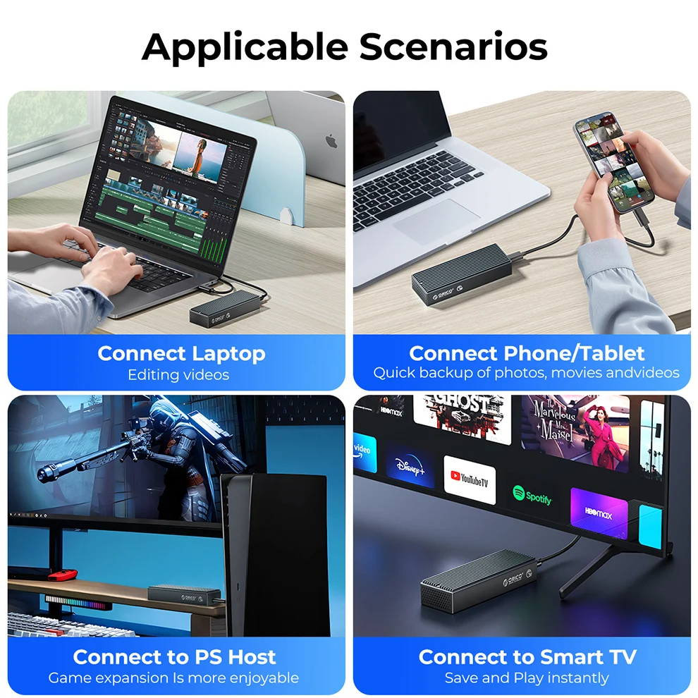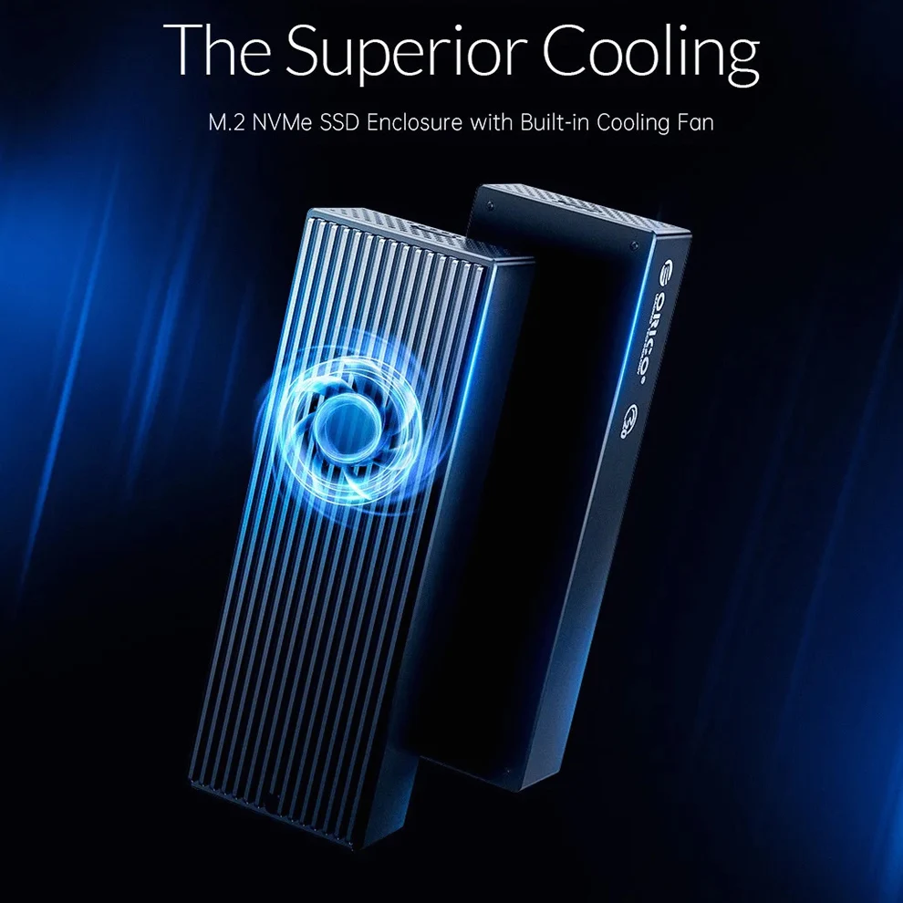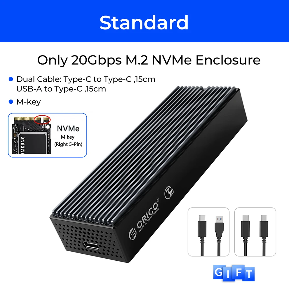 Upgrade your external storage with the ORICO 20Gbps M.2 NVMe Enclosure, featuring a sleek black and metallic aluminum alloy design. Supporting M-Key NVMe SSDs up to 2TB, it delivers lightning-fast data transfer speeds of up to 20Gbps via USB 3.2 Gen2x2, with theoretical read speeds reaching 2060MB/s and real-world speeds around 2000MB/s read and 1800MB/s write. Compatible with sizes 2230, 2242, 2260, and 2280, it supports Windows, Mac OS, Linux, and Android. Equipped with a silent cooling fan, dual-layer heat sink, LED status indicator, and included dual cables, this enclosure makes high-speed external SSD storage reliable, durable, and easy to install in just four steps.
