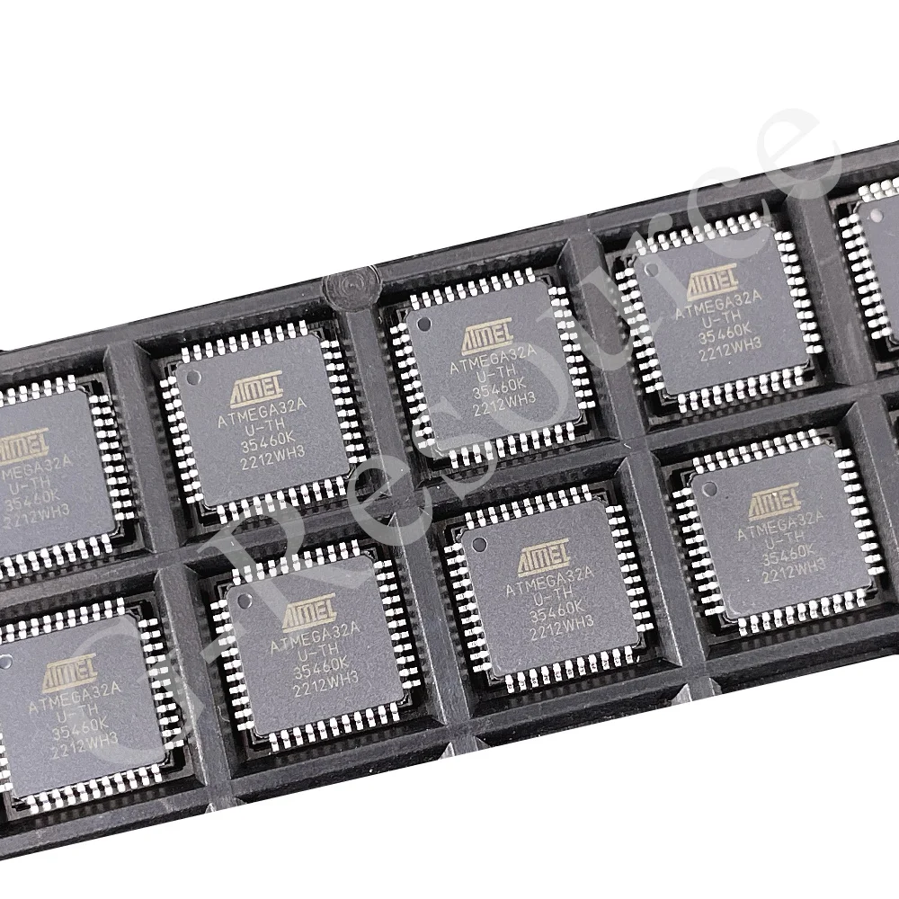 Experience reliable performance with the new, original ATMEGA32A-AU 8-bit microcontroller, featuring 32K bytes of flash memory in a TQFP-44 package. Designed for embedded systems, it offers a sleek black square body with a flat top surface adorned with metallic gold-colored markings, including the model number and brand logo, ensuring precise identification. The 44 evenly spaced, shiny metallic pins extend from the edges, providing a clean, orderly appearance and secure soldering options. Perfect for a range of applications requiring moderate processing power and memory, this high-quality microcontroller combines professional aesthetics with dependable functionality to meet your embedded project needs.