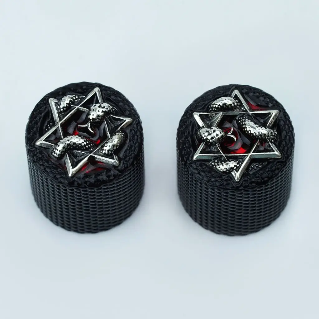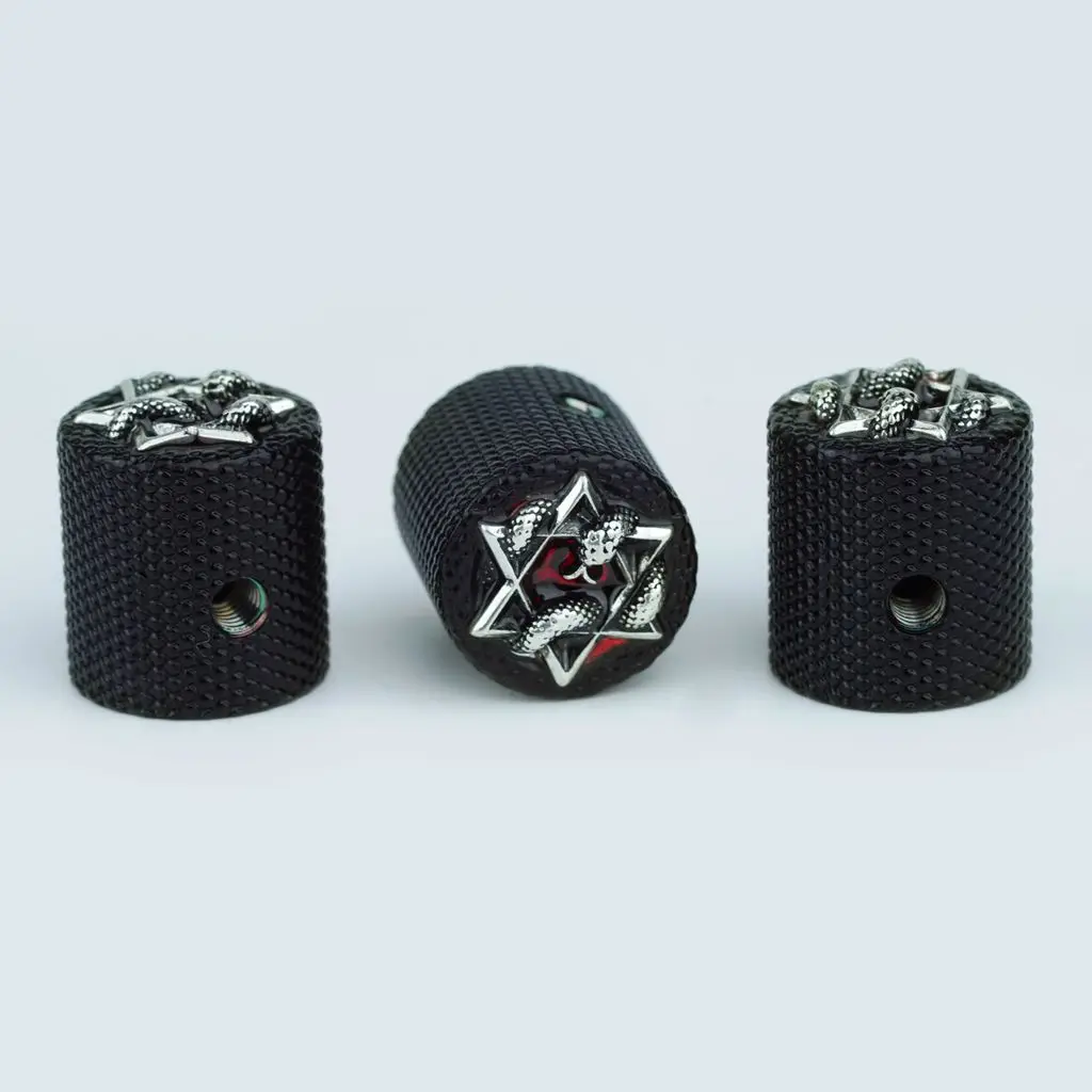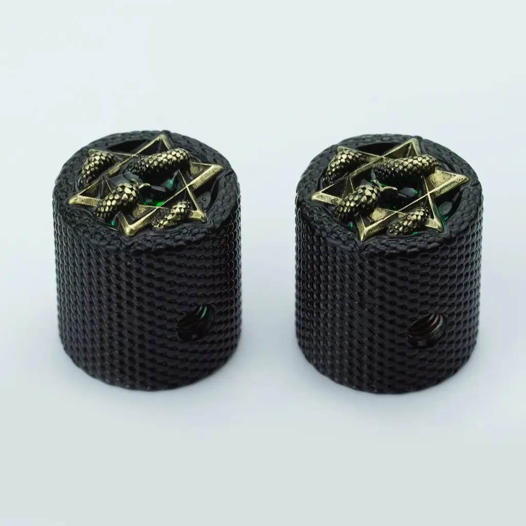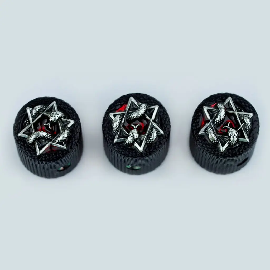 Imagine enhancing your guitar or bass with these stunning control knobs, bringing a touch of luxury and intricate craftsmanship to your instrument. Each knob features a cylindrical shape with a textured black metal surface, designed for a firm grip during adjustments. The top showcases a detailed gold-colored overlay shaped like a six-pointed star, intertwined with elaborate serpent motifs, creating a sophisticated, ornate appearance. Available in sets of 2 or 3, with color accents such as gray, red, and gold, these knobs blend dark metallic tones with shimmering highlights for a striking aesthetic. Perfect for musicians seeking to customize and elevate their instrument’s style, these knobs combine functionality with artistry.