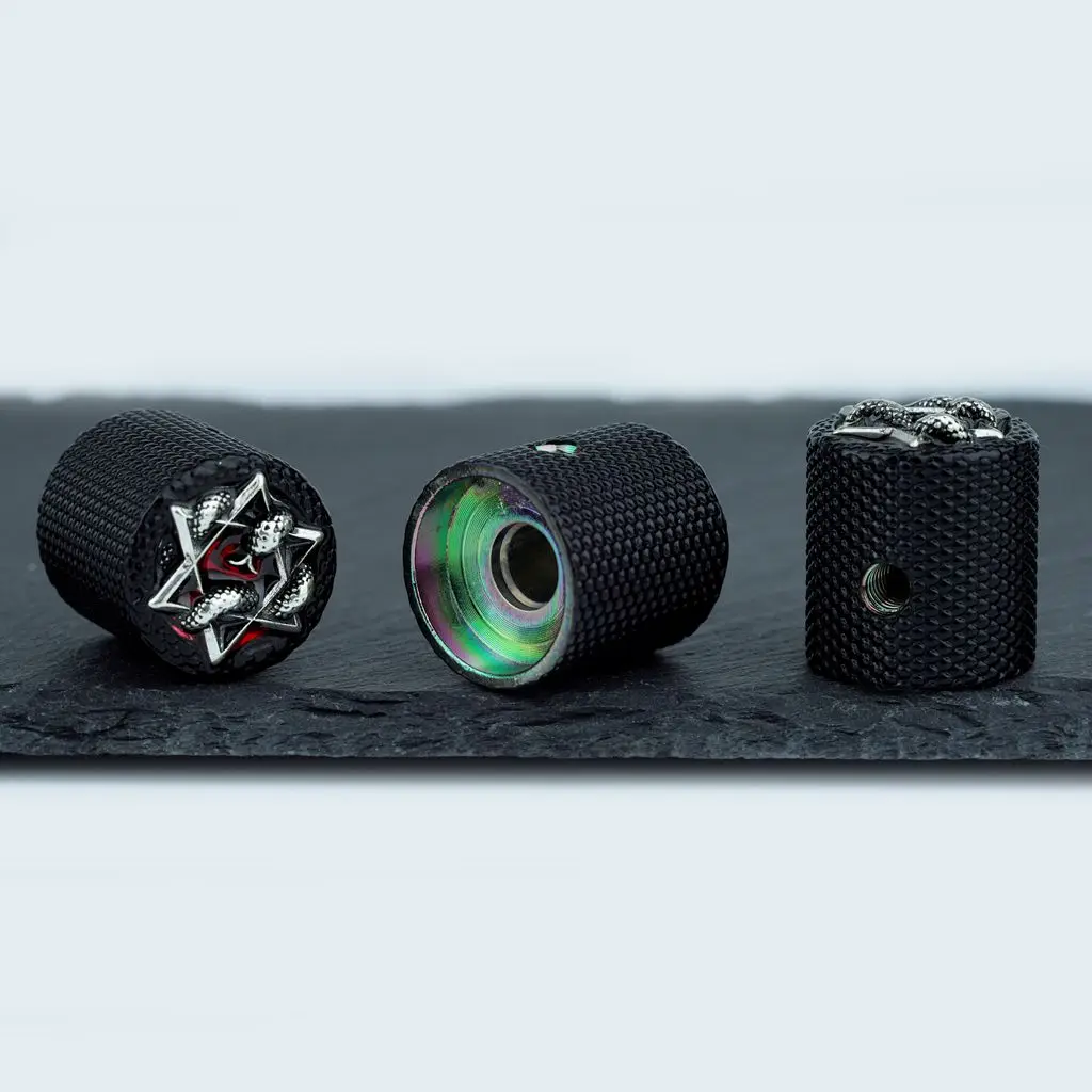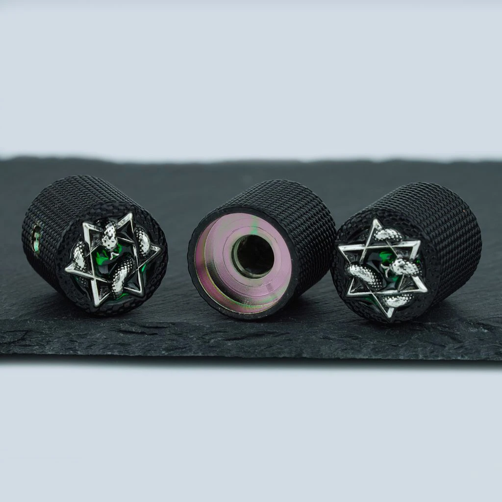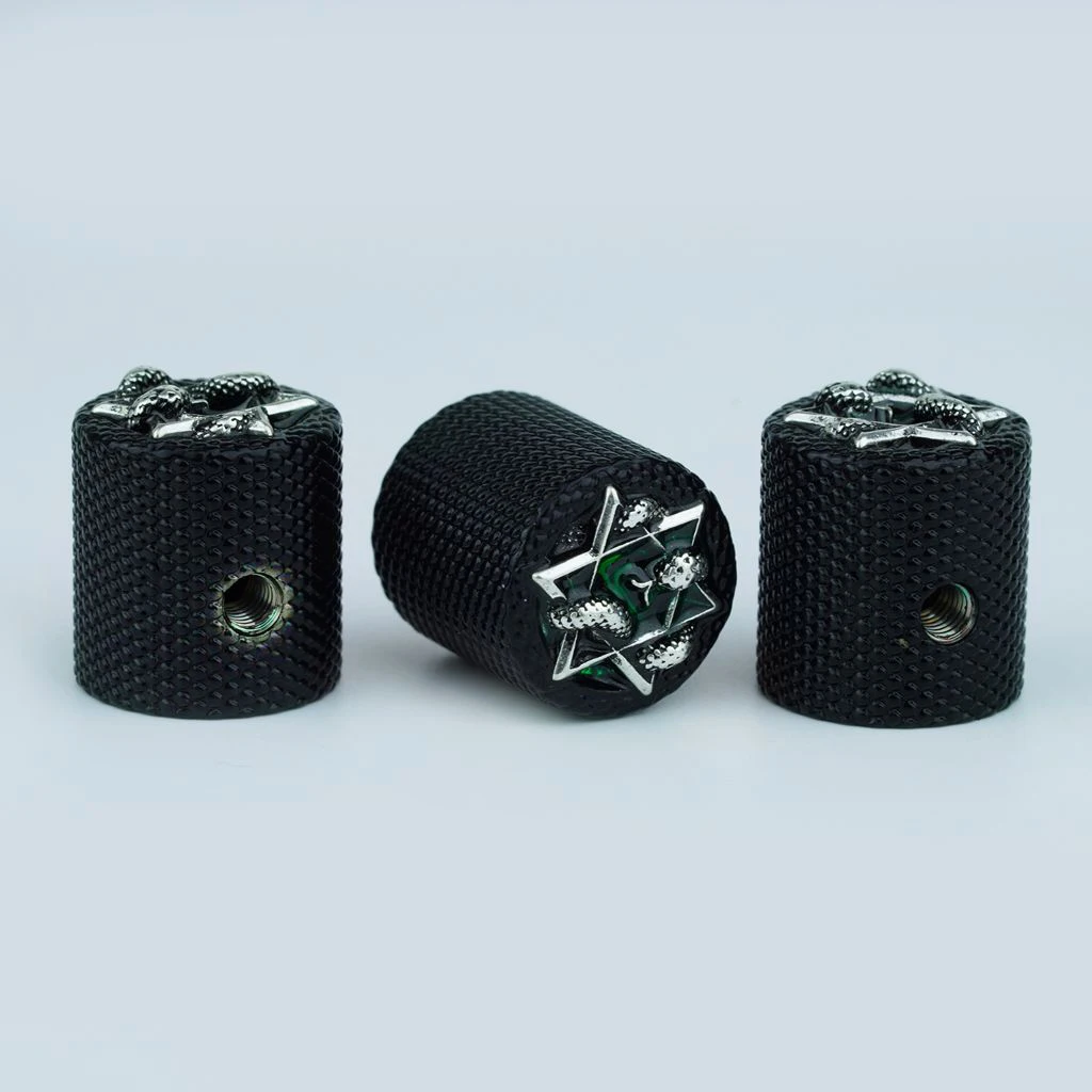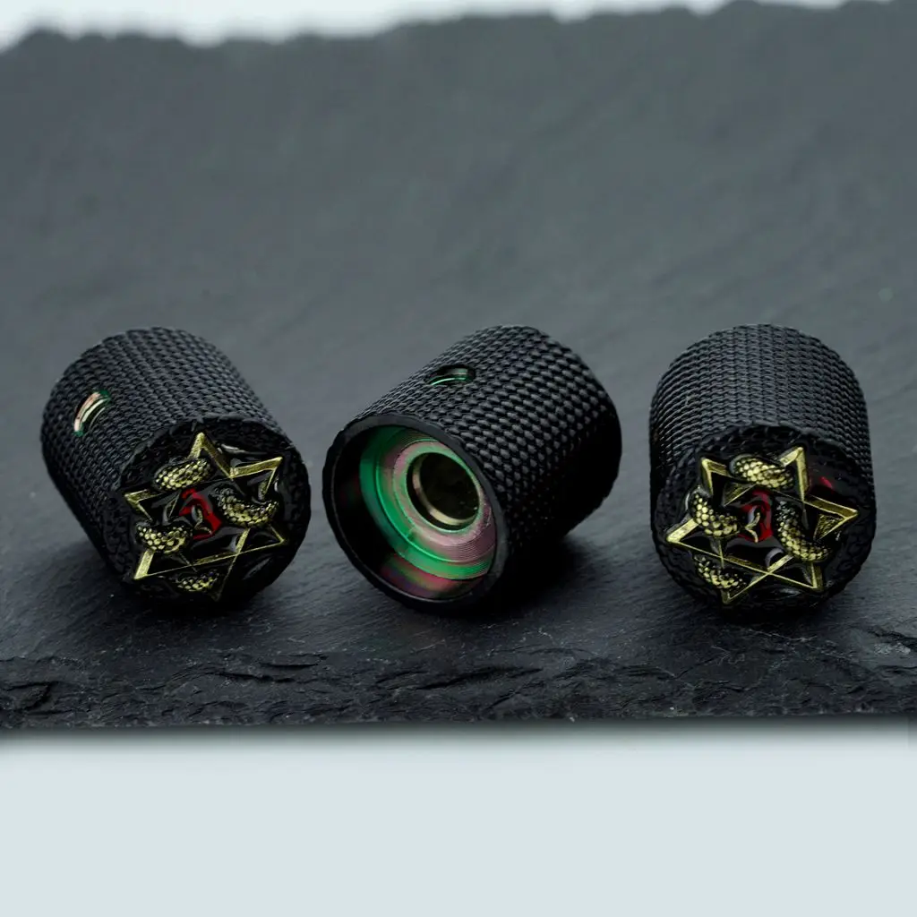Imagine enhancing your guitar or bass with these stunning control knobs, bringing a touch of luxury and intricate craftsmanship to your instrument. Each knob features a cylindrical shape with a textured black metal surface, designed for a firm grip during adjustments. The top showcases a detailed gold-colored overlay shaped like a six-pointed star, intertwined with elaborate serpent motifs, creating a sophisticated, ornate appearance. Available in sets of 2 or 3, with color accents such as gray, red, and gold, these knobs blend dark metallic tones with shimmering highlights for a striking aesthetic. Perfect for musicians seeking to customize and elevate their instrument’s style, these knobs combine functionality with artistry.