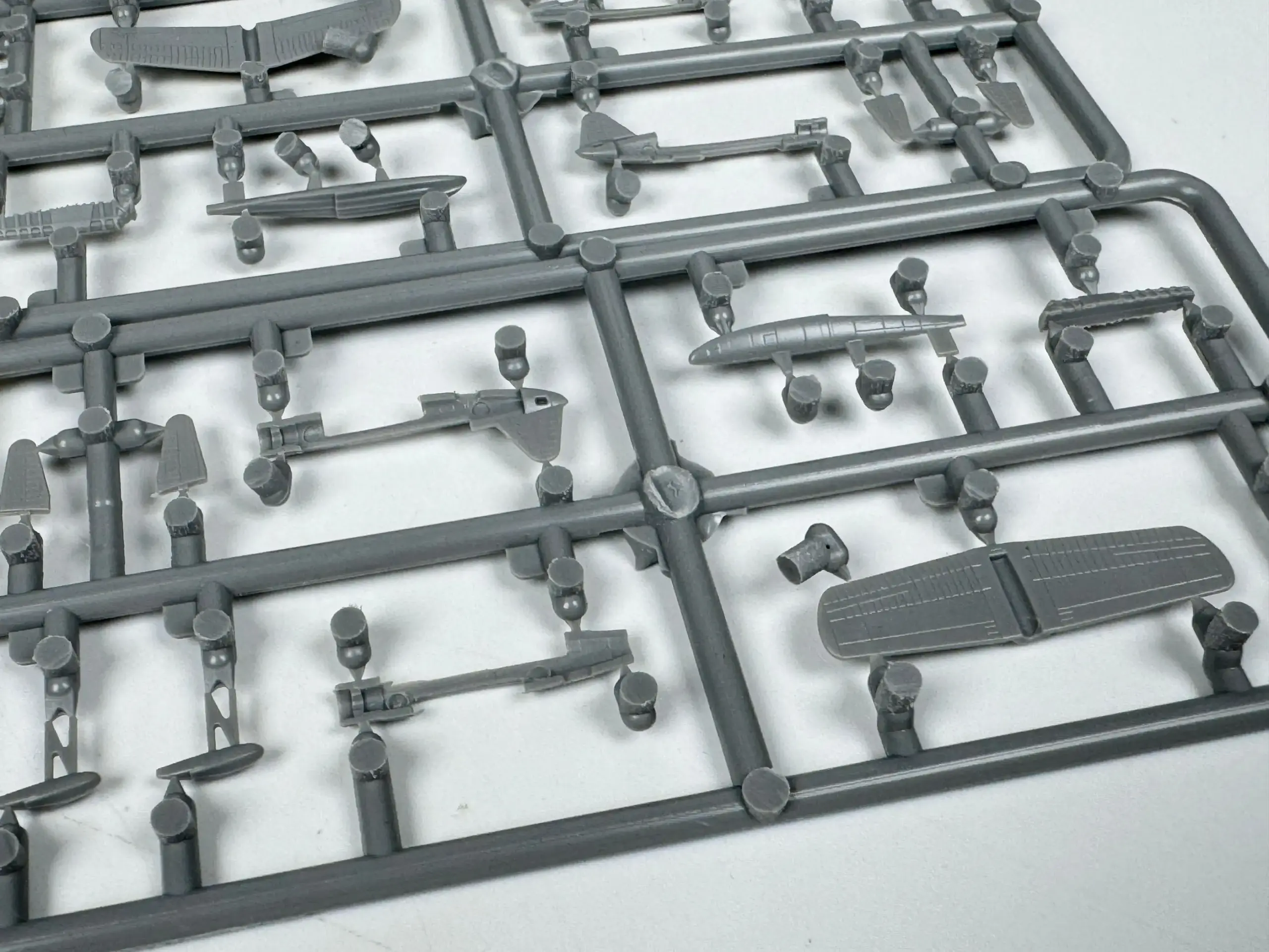 - Contains detailed gray plastic sprues modeling the fuselage, wings, tail, and structural parts, capturing the authentic design of the OS2U-1 Kingfisher aircraft accurately.