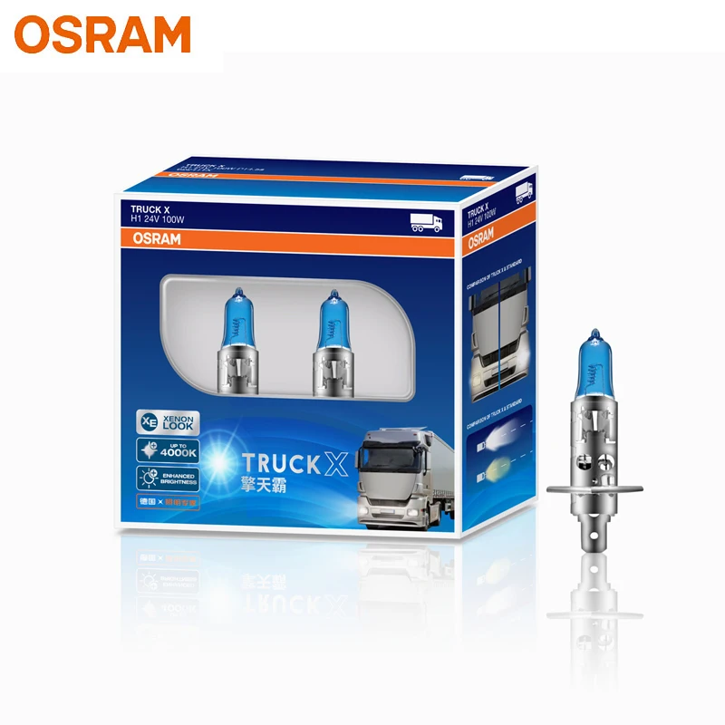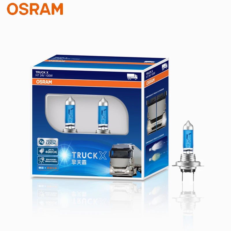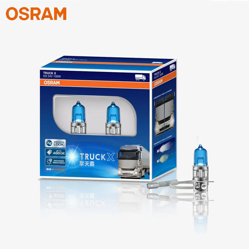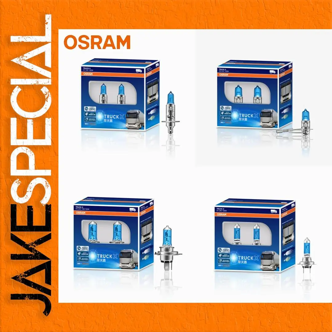Experience superior illumination with this pair of OSRAM halogen headlight bulbs, specially designed for trucks and commercial vehicles. Featuring a sleek blue tint, each bulb emits a bright, white light at 4000K, enhancing visibility and safety during night driving or adverse weather conditions. Crafted with durable materials, these bulbs incorporate clear glass housings that display intricate filaments, complemented by metallic bases for a robust, high-quality appearance. The different models (H1, H3, H4, H7) ensure a perfect fit for various high beam, low beam, or fog light applications. Elevate your vehicle’s lighting performance with these reliable, long-lasting halogen bulbs.