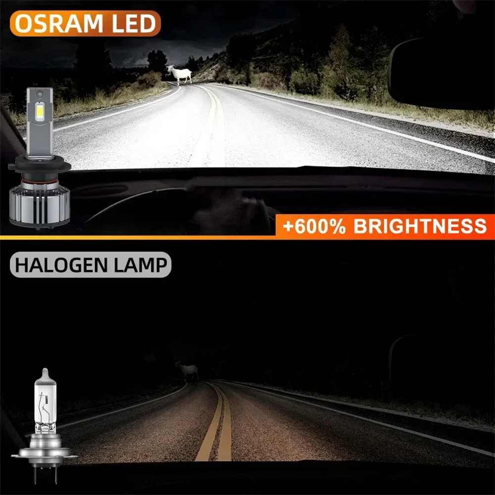 - Produces a cool white daylight effect at 6,000K, improving clarity, contrast, and safety during nighttime driving or adverse weather conditions, with a brightness increase of up to 600% compared to standard halogen bulbs.