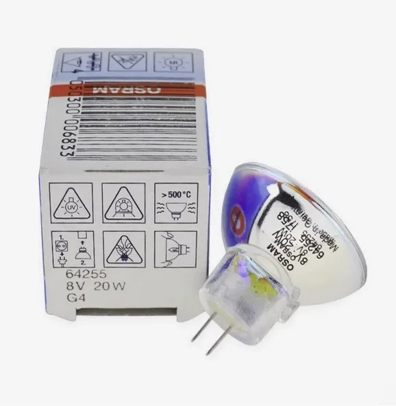 Experience reliable illumination with the OSRAM 8V20W G4 halogen lamp, designed for microscopes and microplate readers. Featuring a compact 35mm diameter and a G4/GZ4 base with two parallel metal pins, this high-quality bulb emits a precise, bright light ideal for scientific applications. It operates at 8V and 20W, ensuring consistent performance with a lifespan of approximately 50 hours. Crafted in Germany or Mexico, this sleek, reflective metallic reflector bulb combines modern aesthetics with efficient functionality, making it a trusted choice for detailed and accurate lighting in laboratory settings.