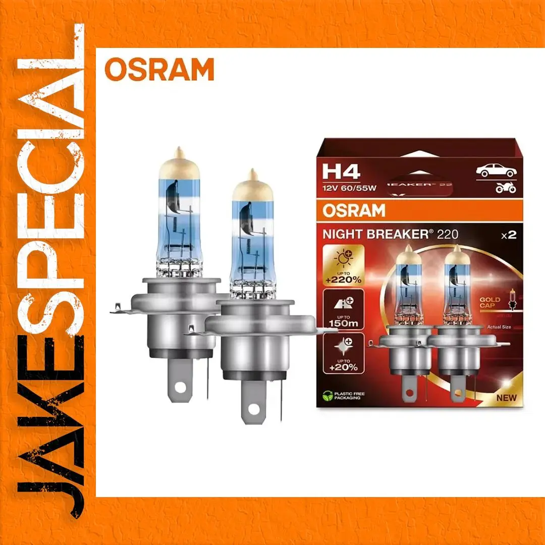Imagine driving confidently at night, assured by the brightest headlights available. This this OSRAM H4 Night Breaker 220 offers up to 220% more brightness, enhancing your visibility and safety on dark roads. The clear, transparent glass envelopes reveal precise filaments, topped with a subtle amber tint for a warm glow. Its sleek metallic base with a flat tab ensures secure fitting in high and low beam H4 sockets. The modern packaging emphasizes premium quality and performance. This high-performance halogen bulb provides long-distance illumination up to 150 meters, producing 20% whiter light at 3900K. Perfect for those who value safety, clarity, and style during nighttime drives.
