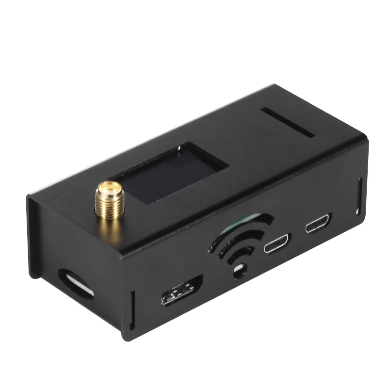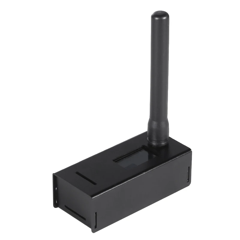 - Includes a small display screen for real-time status updates and simple configuration, paired with a gold-colored threaded antenna connector for secure attachment.