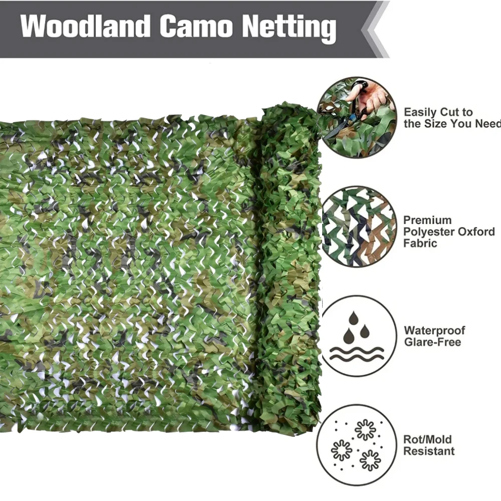 Transform your outdoor environment with this versatile camouflage netting, designed for concealment and shading in any setting. Crafted from waterproof, high-quality rip-stop Oxford fabric, this net features a realistic 3-D leaf pattern in natural green, brown, and tan shades, blending seamlessly into outdoor surroundings. Its dense, layered foliage mimics ground cover and foliage. Lightweight yet durable, it offers excellent tear resistance and a no-glare matte finish, preventing shine and reflection. Perfect for hunting, tactical training, gardening, wildlife photography, or home decoration, this net is easy to customize and extend, providing a practical solution for all concealment needs. Its resilient construction ensures long-lasting use in severe weather conditions, making it an essential item for outdoor enthusiasts.