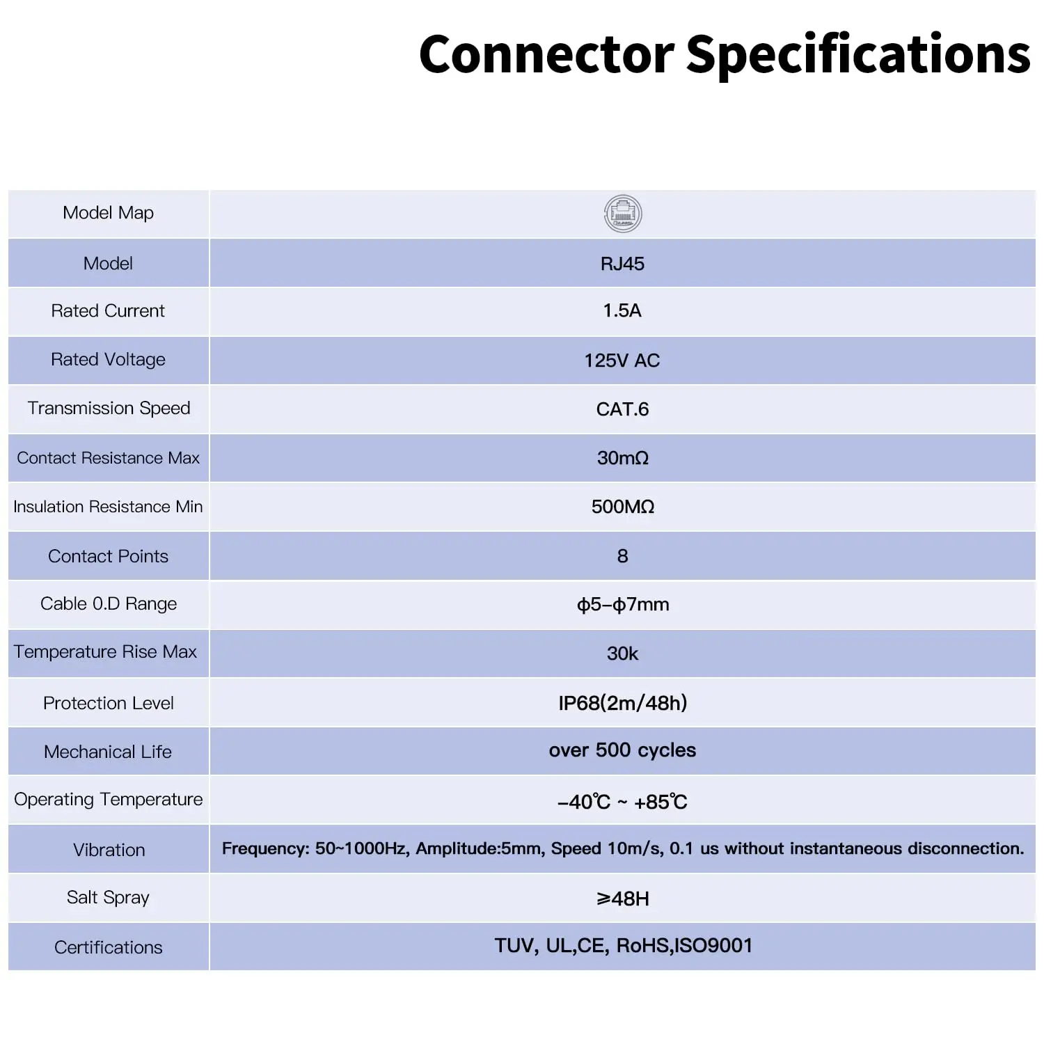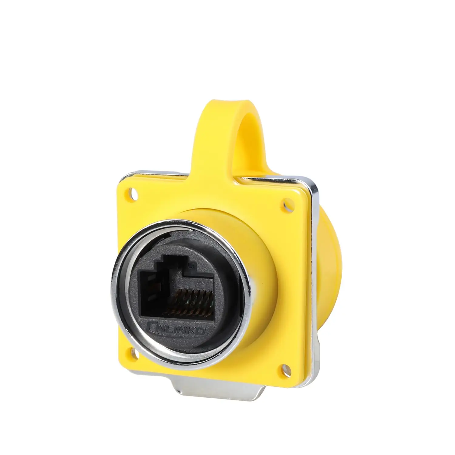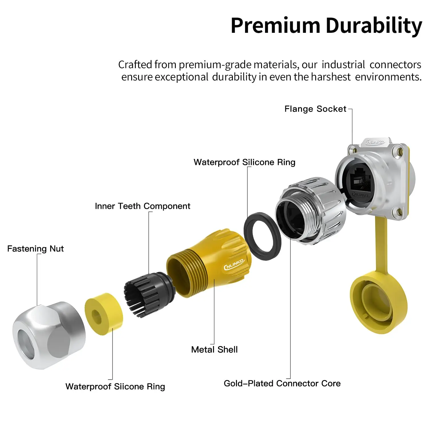 Experience ultimate durability and reliable connectivity with this high-performance outdoor RJ45 Ethernet connector. Crafted with a vibrant yellow housing made of engineering plastics, it is visually striking yet built to withstand harsh environmental conditions. The IP67-rated design guarantees complete dust and water resistance, ideal for outdoor installations exposed to extreme weather. With an easy locking mechanism, secure connections are effortless, ensuring minimal signal loss during high-speed data transfer. The connector's 8-pin configuration offers robust, dependable performance, supporting cable sizes from 0.15mm² to 0.2mm² (26-24 AWG). Certified by UL, TUV, CE, and RoHS, this product combines safety, quality, and longevity, perfect for professional network setups in outdoor or industrial environments.