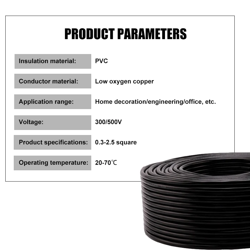 Experience high-quality electrical wiring with this outdoor sheathed power cable, designed for reliable performance in various environments. Featuring a robust PVC insulation sheath and low oxygen copper conductor, this cable ensures excellent insulation, conductivity, and safety. Available in multiple configurations, including 2, 3, 4, 5, or 6-pin options, and flexible wire gauges from 0.3 to 2.5 square millimeters, it adapts perfectly to diverse electrical needs. Rated at 300/500V and capable of operating efficiently in temperatures from -20°C to 70°C, this cable is ideal for home appliances and outdoor installations. Its durable construction and neat, organized appearance make installation and maintenance straightforward, providing peace of mind for long-term use. Trust this versatile power cable to deliver strength and reliability for your electrical projects.
