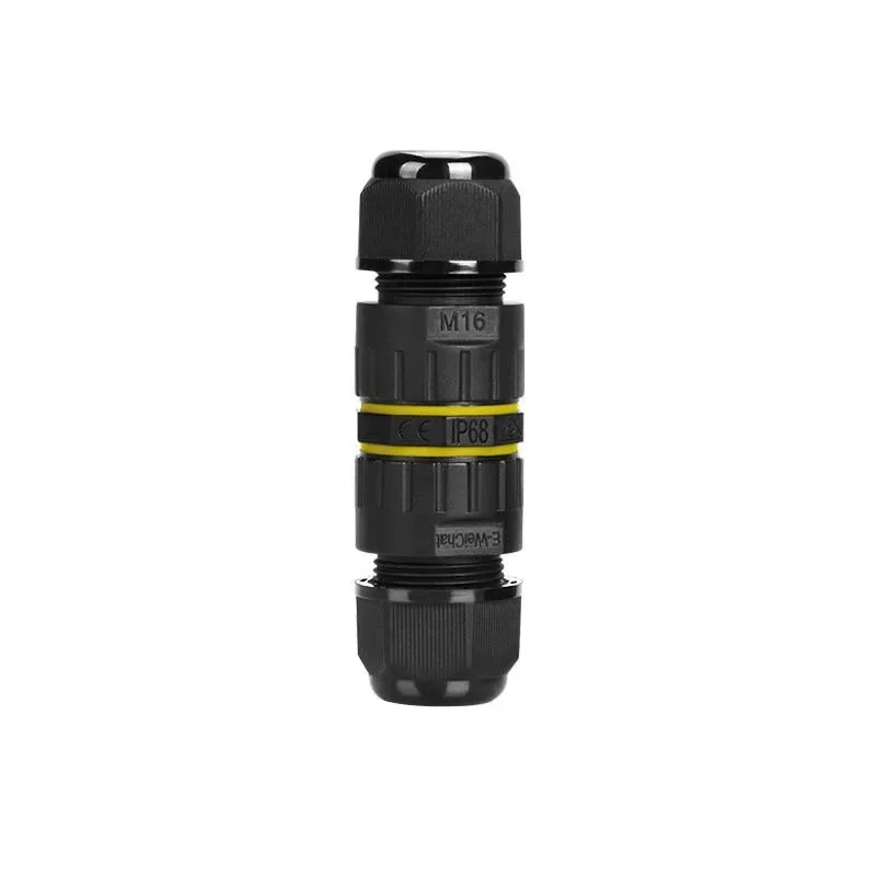 Experience the reliability of this waterproof cable connector designed for outdoor lighting and electrical projects. Featuring a sleek, cylindrical matte black finish, it combines durability with an industrial aesthetic. The textured, ribbed surface ensures a secure grip during installation, while bright yellow rings provide a bold visual cue for quick identification. The green internal sealing component not only adds a splash of color but also highlights its waterproof integrity. Made from high-quality nylon plastic (PA66), this connector withstands harsh environmental conditions, including extreme temperatures from -40°C to 105°C. Its IP68 rating guarantees protection against dust and water ingress, making it perfect for outdoor lighting, garden fixtures, or exterior electrical wiring. This connector’s robust design promises long-lasting performance in any weather.