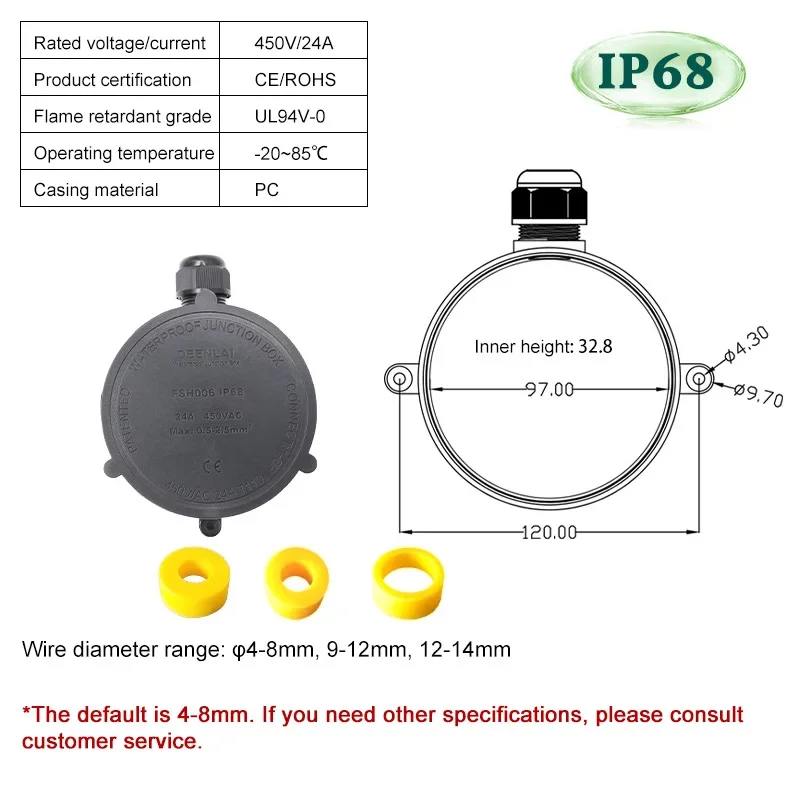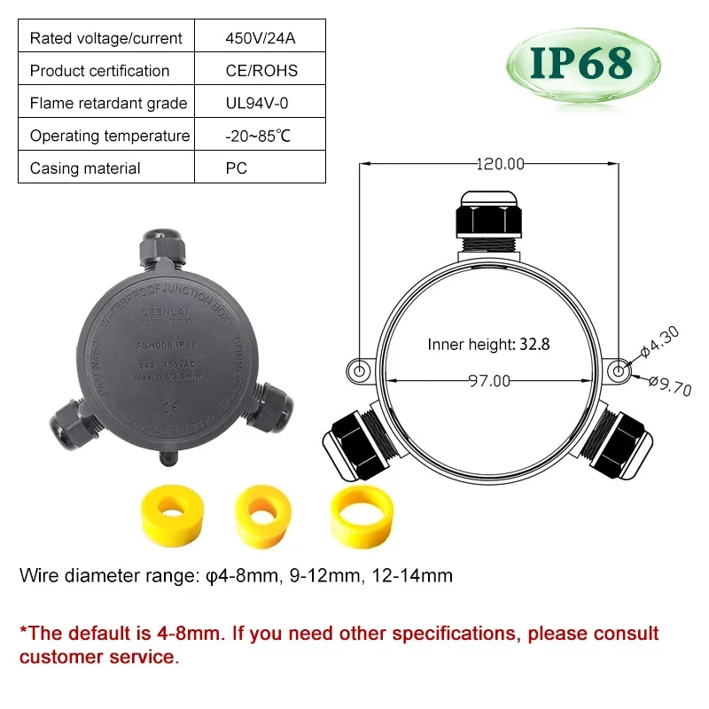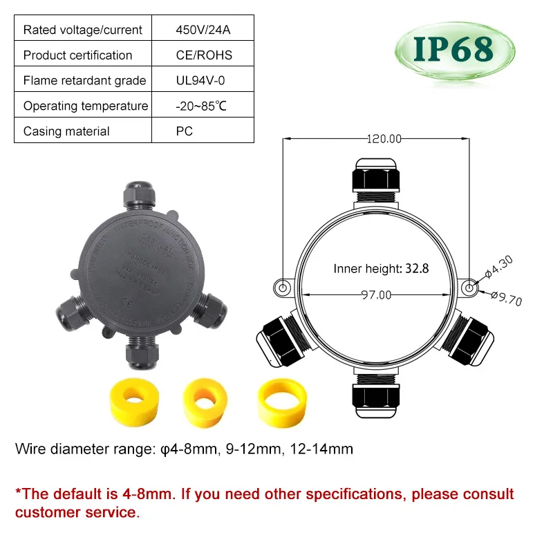 - Supports a rated current of 24A and maximum voltage of 450V, with compatibility for wires from 4 to 8mm in diameter, making it versatile for various outdoor electrical applications.