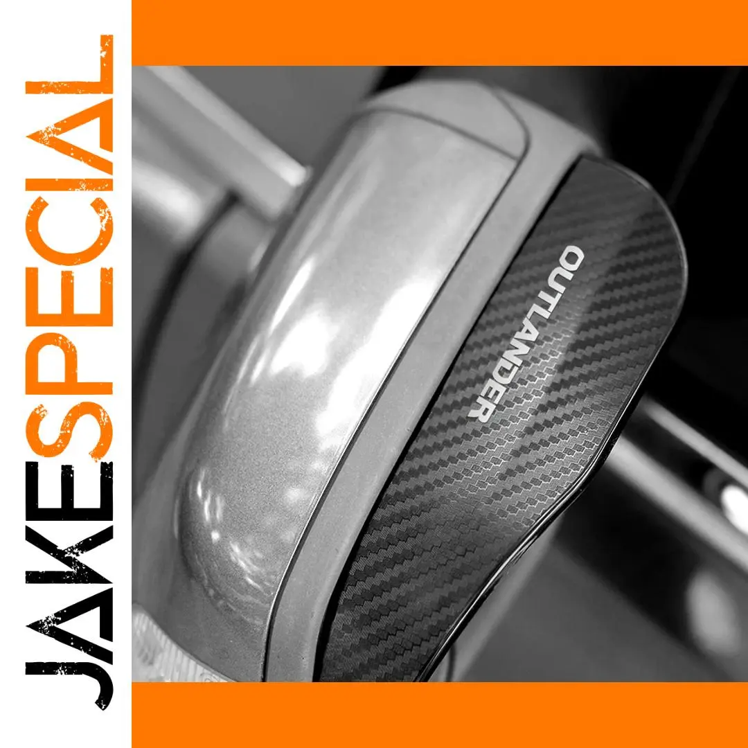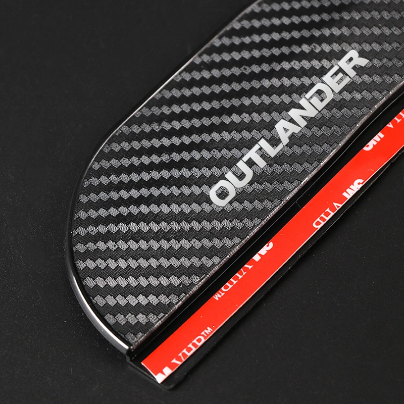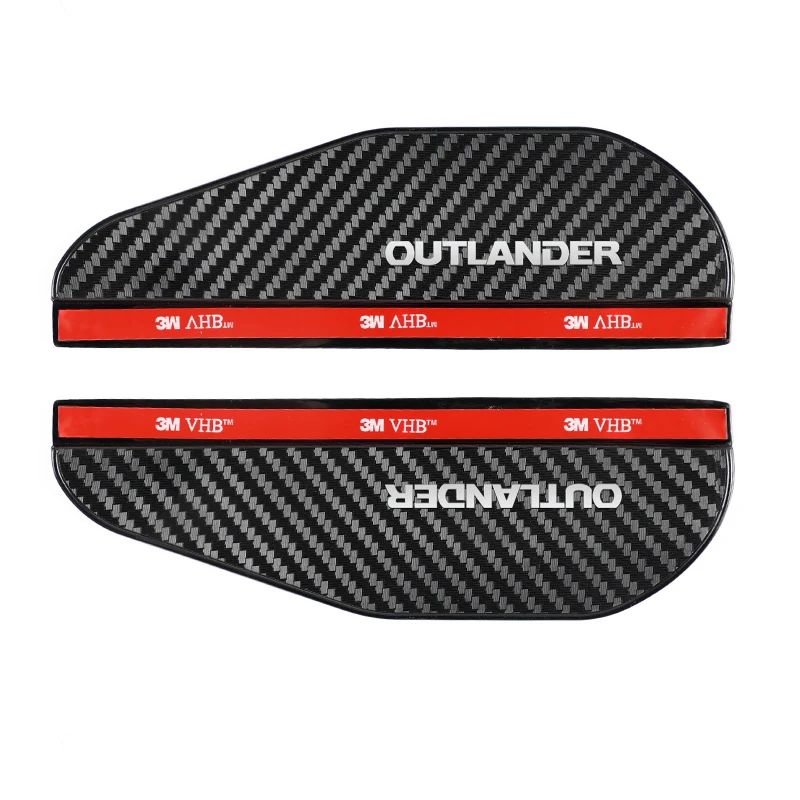 Enhance your Mitsubishi Outlander with this sleek rain shield visor designed specifically for the side rearview mirrors from 2014 to 2019. Made from durable rubber, it features a textured surface resembling carbon fiber or solid black finish, adding a modern touch to your vehicle. The bold white “OUTLANDER” lettering creates a striking contrast, giving your car a personalized, sophisticated look. This accessory effortlessly combines style and function, helping to keep your mirrors clear of rain and debris while seamlessly enhancing your vehicle's aesthetics. Easy to install on the internal side of the mirror, it offers a perfect fit that integrates smoothly without compromising your mirror's shape or function. Elevate your Outlander’s style today with this functional upgrade.
