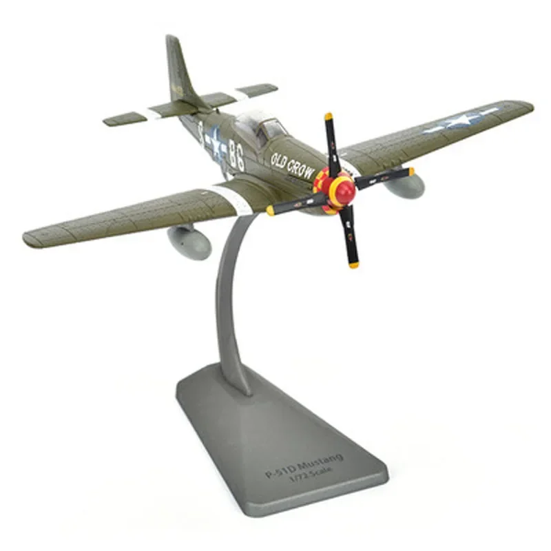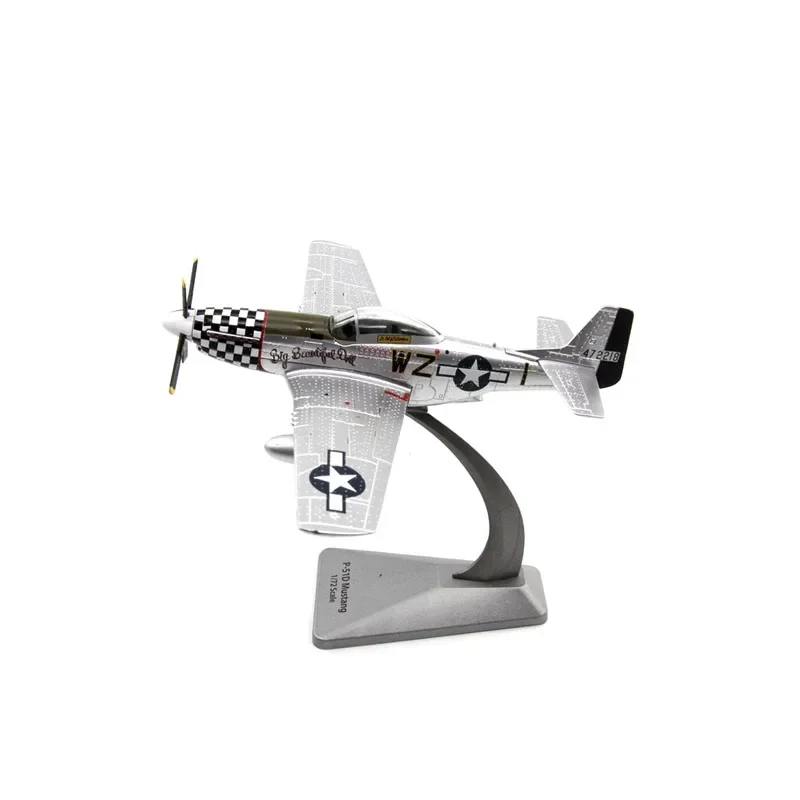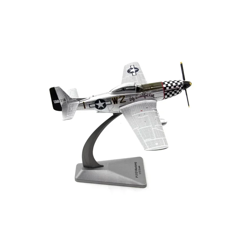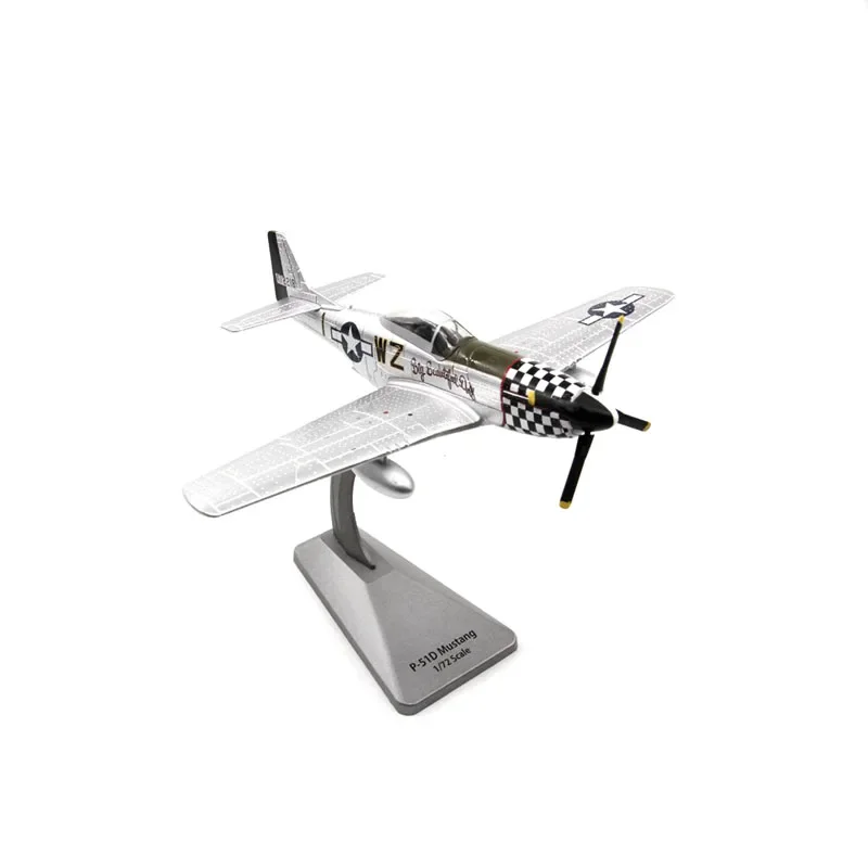 Experience the detailed realism of the P-51D Mustang fighter aircraft with this 1/72 scale diecast model, measuring 13.6 cm in length with a 15.6 cm wingspan and 5.6 cm height. Crafted from plastic and rubber, it features a rotatable propeller and fixed wheels, designed for static display and collection. Finished in a sleek metallic silver with sharp paint lines, it showcases accurate markings such as black-and-white checkered nose patterns, white and blue roundels, and black stencil decals, capturing the vintage WWII military aesthetic. This fragile, highly detailed collector’s piece is suitable for ages 14 and above and arrives in a boxed presentation, perfect for aviation enthusiasts.