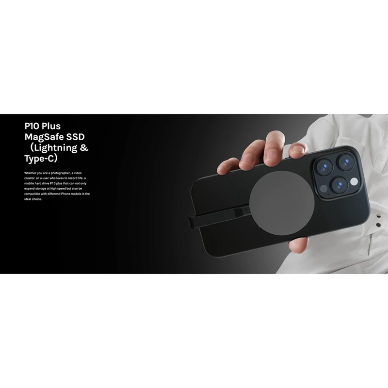 Experience rapid data transfer and seamless portability with this sleek P10 Plus Magnetic External SSD. Designed with a smooth, matte black metal finish, it offers a modern, minimalist aesthetic that complements any setup. Its circular, disk-shaped body exudes durability and elegance, making it an ideal storage solution for professionals and tech enthusiasts alike. The magnetic attachment feature ensures quick, secure connection to compatible devices, while the compact, lightweight design enables effortless transport. Compatible with iPhone models 14, 13, and 12 Pro/Max, this SSD transforms how you transfer and manage files on the go. Elevate your data management with a device that combines style, power, and reliability effortlessly.