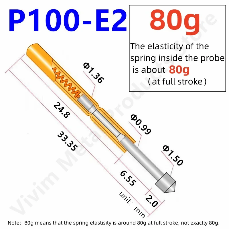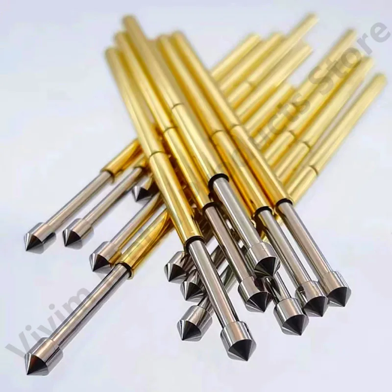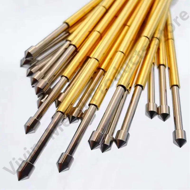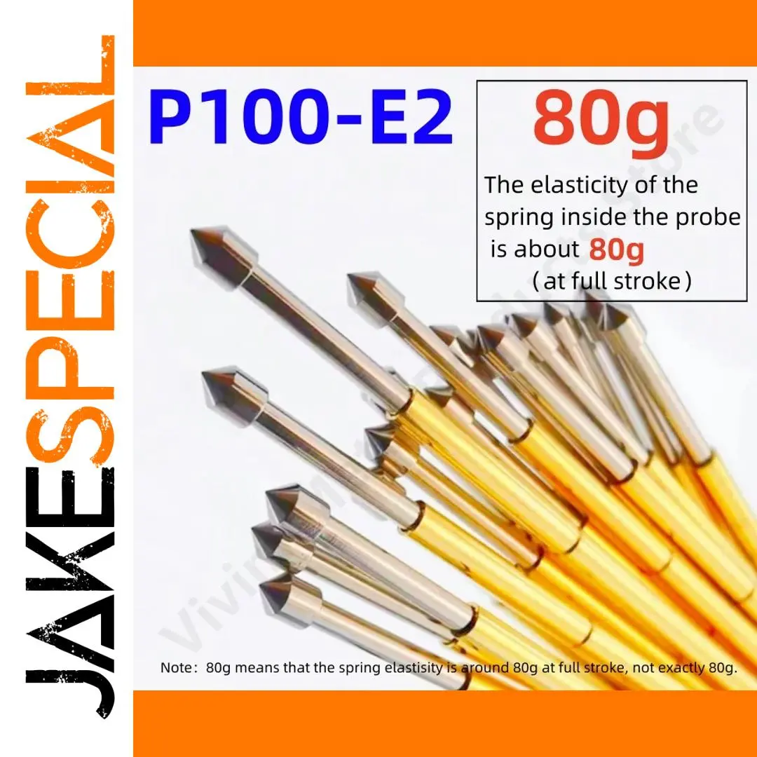 Enhance your circuit board testing with this set of high-quality P100-E2 or P100-E probes, featuring a durable nickel-copper needle head with a 1.50mm diameter, a 1.36mm shank diameter, and a total length of 33.35mm. Designed for precision, these probes provide a spring force of 80g (special elastic) for reliable connectivity in switching, testing, and diagnostic tasks. Available in sets of 20 or 100 pieces, their sleek cylindrical design with a reflective metallic finish ensures both durability and a professional appearance, making them an essential tool for electronics testing experts.