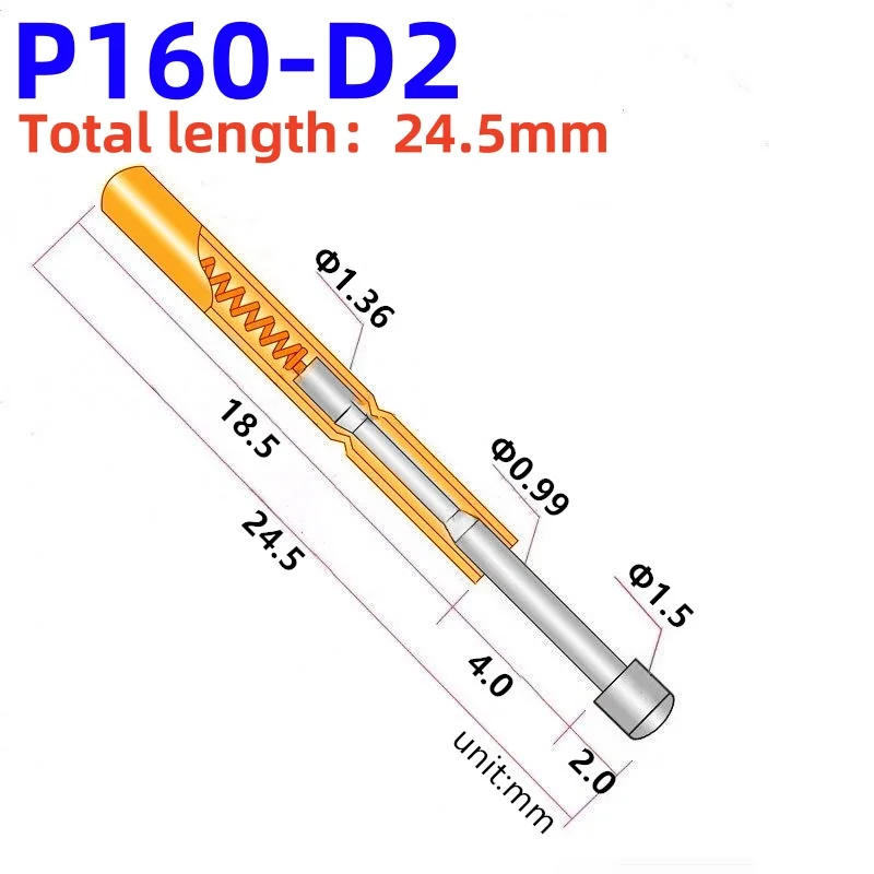 Enhance your PCB testing with this set of 100 high-quality P160-D2 spring test probes, featuring nickel finish and rounded heads with a 1.5mm diameter for precise electrical contact. These sleek, elongated probes have golden shafts for excellent conductivity and corrosion resistance, complemented by darker nickel tips that emphasize accuracy. Designed for professional testing applications, each probe is CE certified, customizable, and crafted for durability and consistent performance. Their polished, minimalist design provides a professional aesthetic, ensuring reliable connections and efficient testing processes. Ideal for electronics technicians and engineers seeking dependable, high-quality test probes for various PCB testing needs.