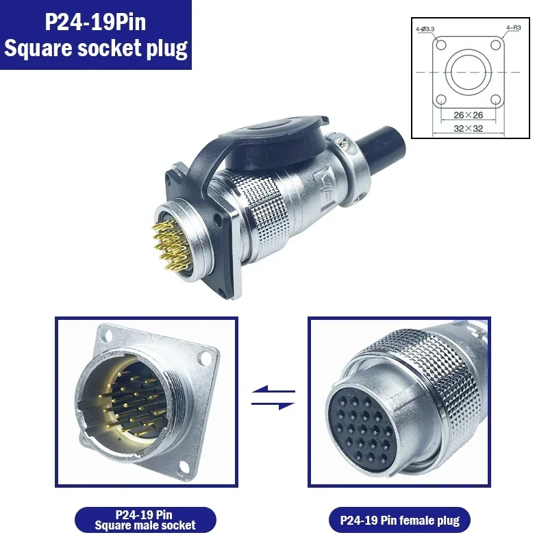 Experience the rugged durability and seamless connection of this this P24 aviation connector, designed specifically for demanding industrial environments. Crafted with high-quality materials, its metallic silver finish exudes a professional, industrial aesthetic. The sleek, cylindrical shape combined with textured ridges around the contact face ensures both functionality and a secure grip. The prominent green circular contact face adds a vibrant touch, making installation easy and precise. Featuring a square flange with four mounting holes, this connector allows for firm attachment to equipment, preventing loosening during rigorous operations. Its robust construction enables it to withstand high temperatures, humidity, and pressure, providing a reliable connection in any harsh setting. Perfect for power supply, manufacturing, and industrial automation, this connector is built to last under tough conditions.