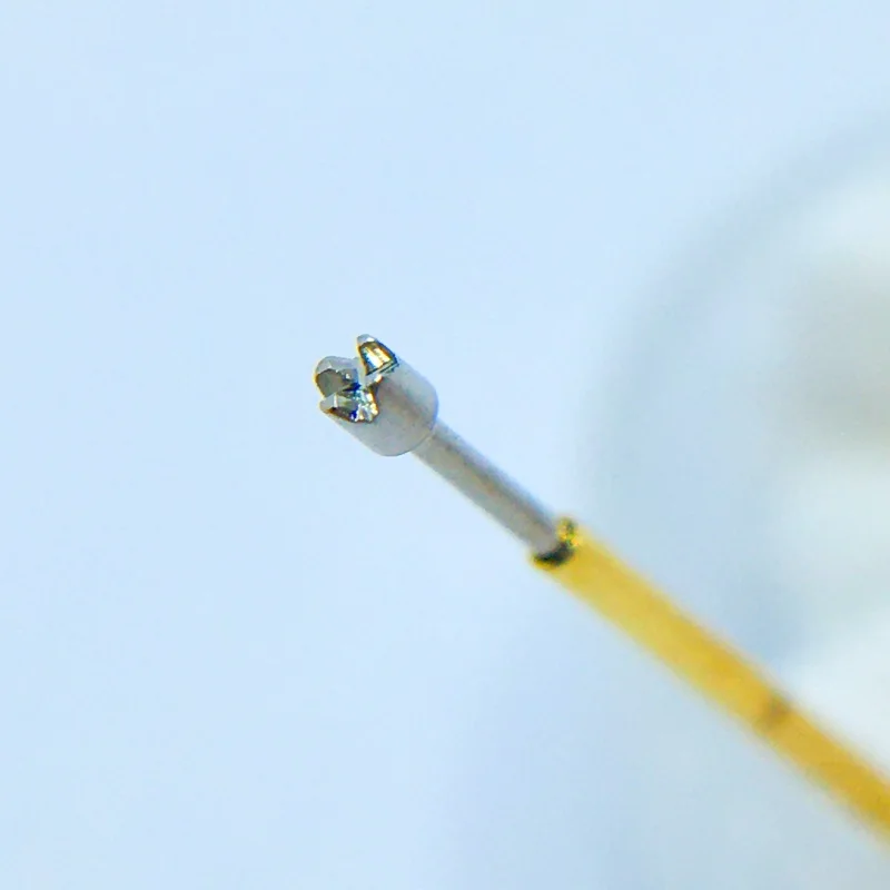 Experience reliable electrical testing with these high-precision P50-Q2 spring test probes, available in 20 or 100-piece sets. Each probe features a total length of 16.55mm, a durable metallic shaft with a 0.68mm barrel diameter, and a 0.48mm plunger diameter. The crown-shaped contact tip measures 0.90mm in diameter, ensuring accurate contact during circuit testing. They are spring-loaded with forces of either 20g or 75g (standard), providing flexibility for various testing requirements. Crafted from high-quality materials with a sleek, reflective surface and vibrant gold upper coating, these probes combine functionality with a professional, minimalist aesthetic, perfect for circuit board testing (ICT) and functional circuit testing (FCT).