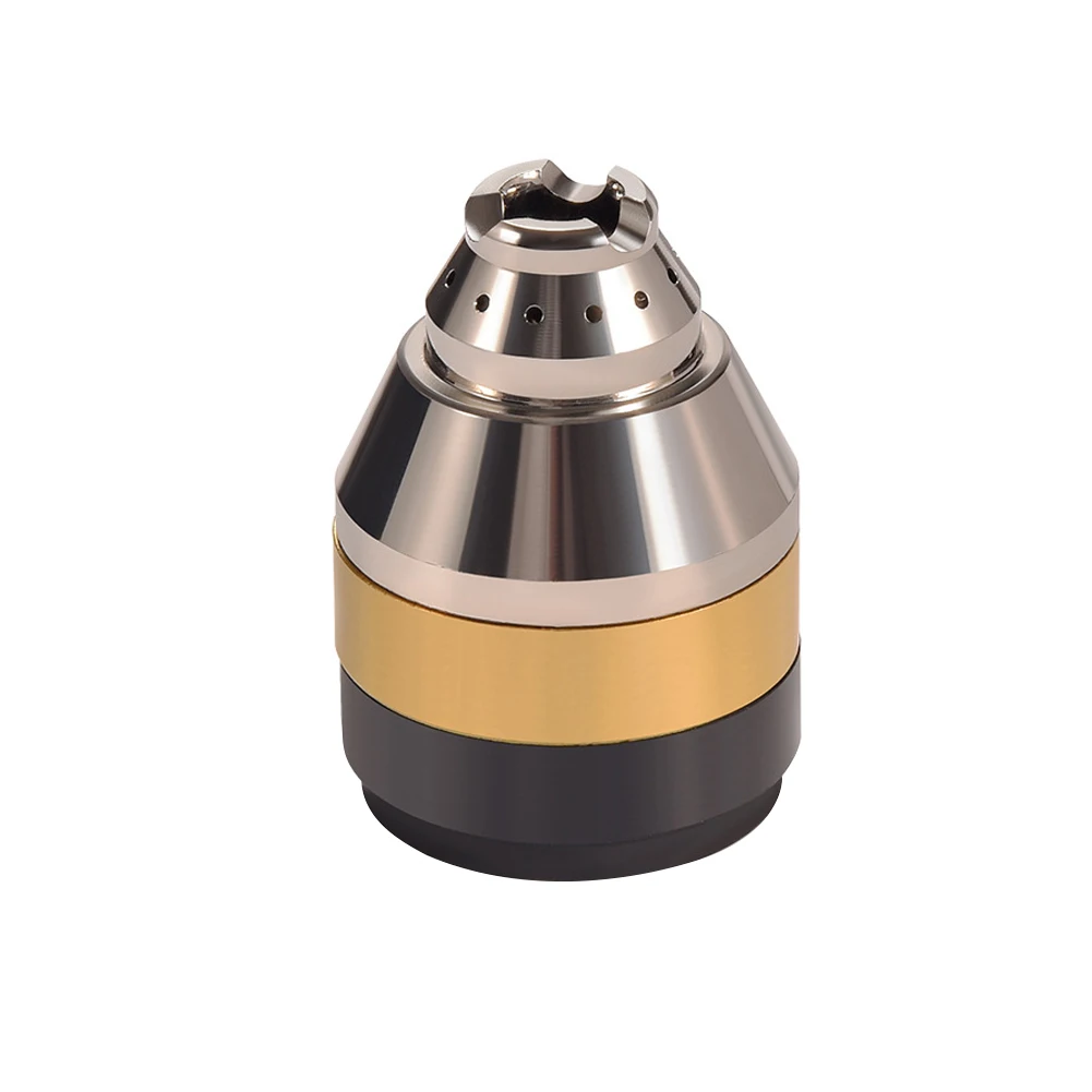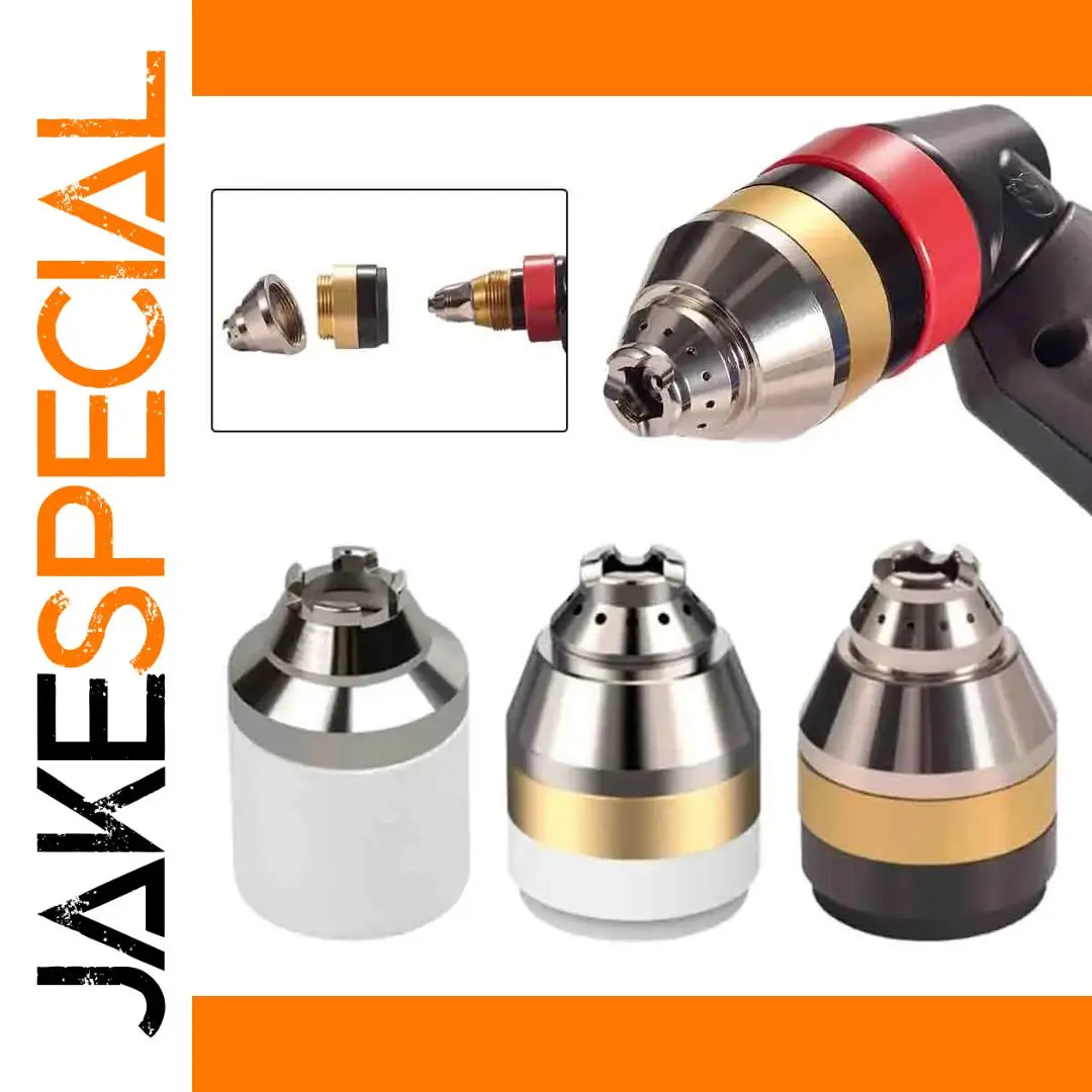 - The set includes a conical, polished metal nozzle with a red and gold band, combining aesthetic appeal with robust durability for precise plasma cutting. Designed for P80 torch models.