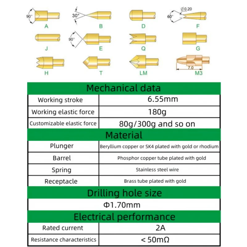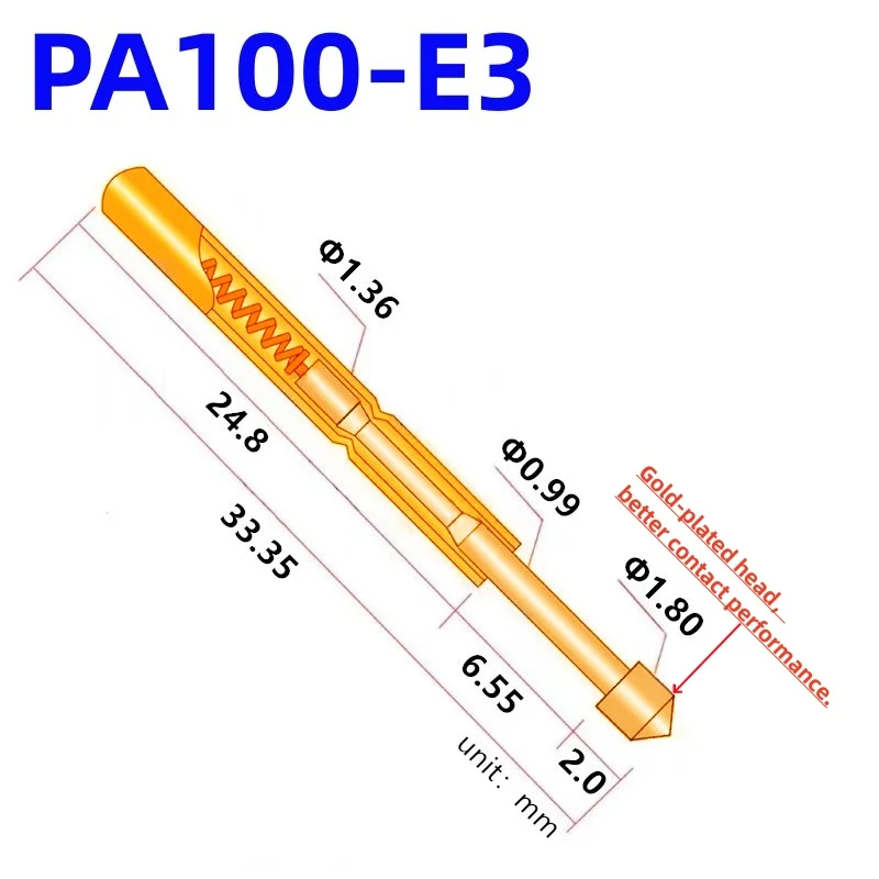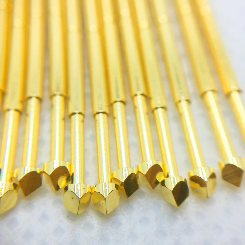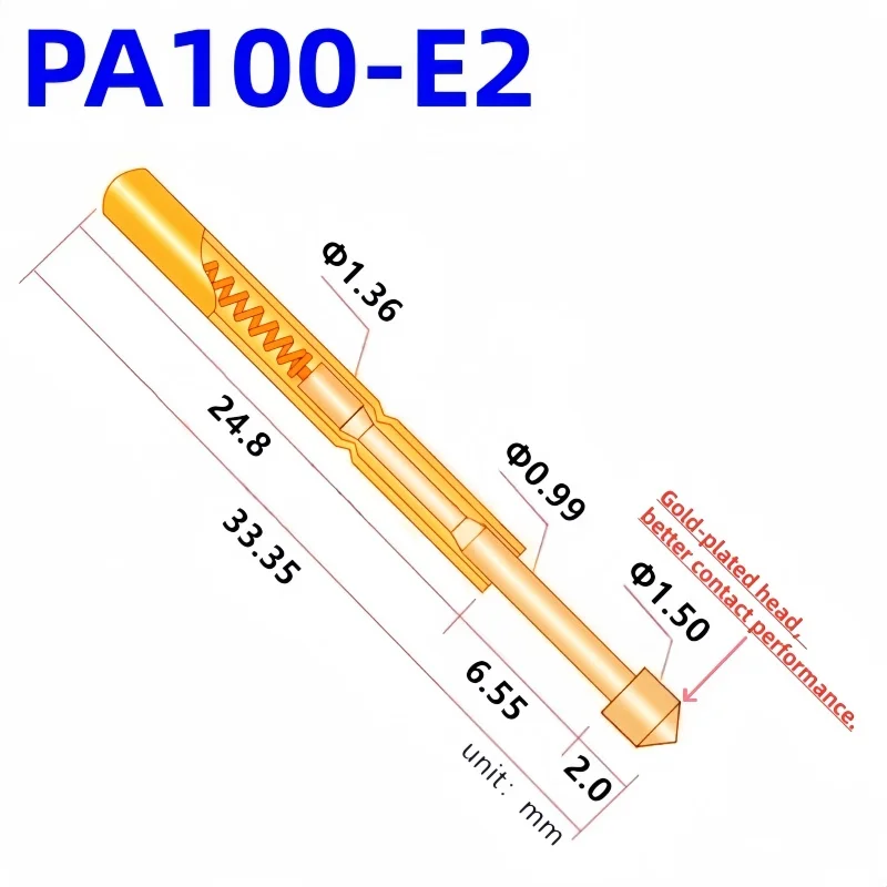 The PA100 Series brass spring test probes are precision-engineered components designed for reliable PCB and electronic component testing. Each probe measures 33.35mm in length with a barrel diameter of 1.36mm and features a polished, reflective gold surface for enhanced conductivity. The tips have diameters ranging from 0.99mm to 1.50mm, depending on the model, with a working stroke of 6.55mm and a standard spring force of approximately 180g, supporting customized forces of 80g or 300g. Rated for 2A current, with a contact resistance of 50mOhm, these probes support a 1.70mm hole drilling diameter and are compatible with multiple models such as PA100-A2, B1, D2, E2, F1, G2, H2, J1, and more, available in packs of 20 or 100 pieces.