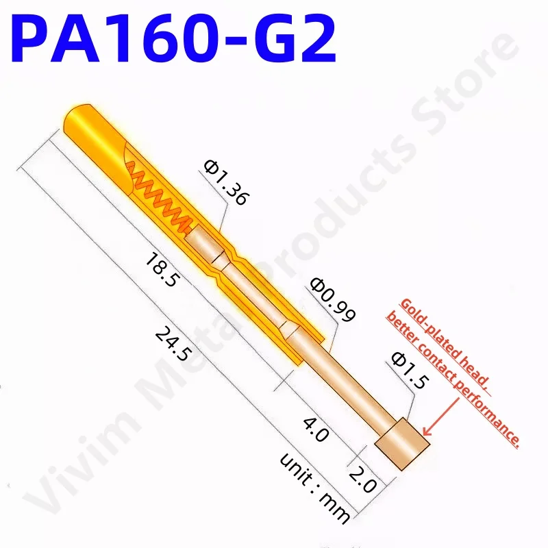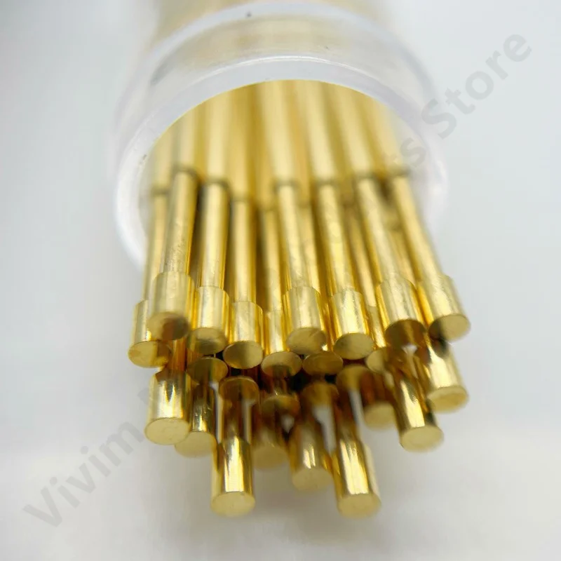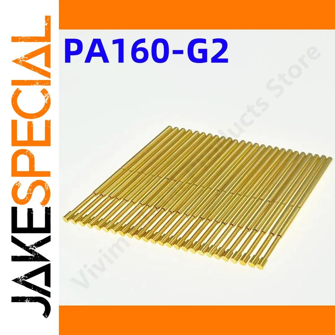 Experience precise circuit board testing with these high-quality PA160-G2, PA160-G, P160-G, and P160-G2 test probes. Crafted from durable copper with gold tips, each probe measures 24.5mm in length, featuring a needle tip diameter of 1.36mm and a head diameter of 1.50mm for secure connections. Designed for electrical testing applications, these probes utilize compression load mechanisms and are available in quantities of 20 or 100 pieces, with a wire diameter of 1.36mm. Their sleek, metallic finish and polished surfaces reflect a professional-grade construction, making them ideal for reliable diagnostic work in circuit testing environments.
