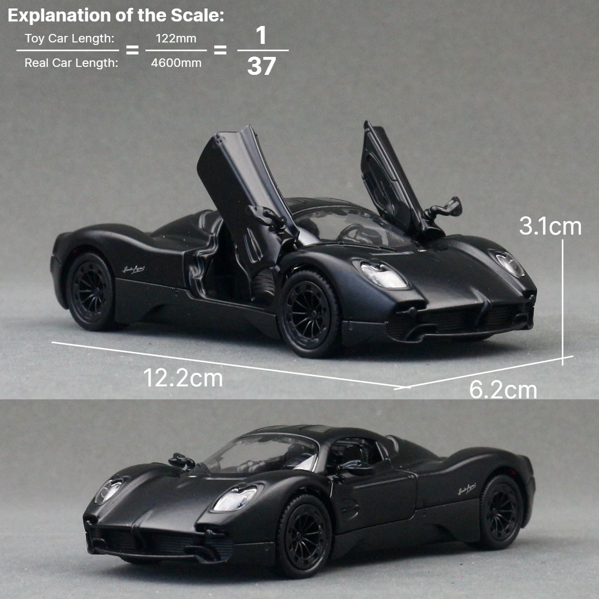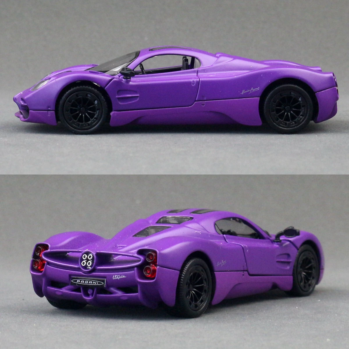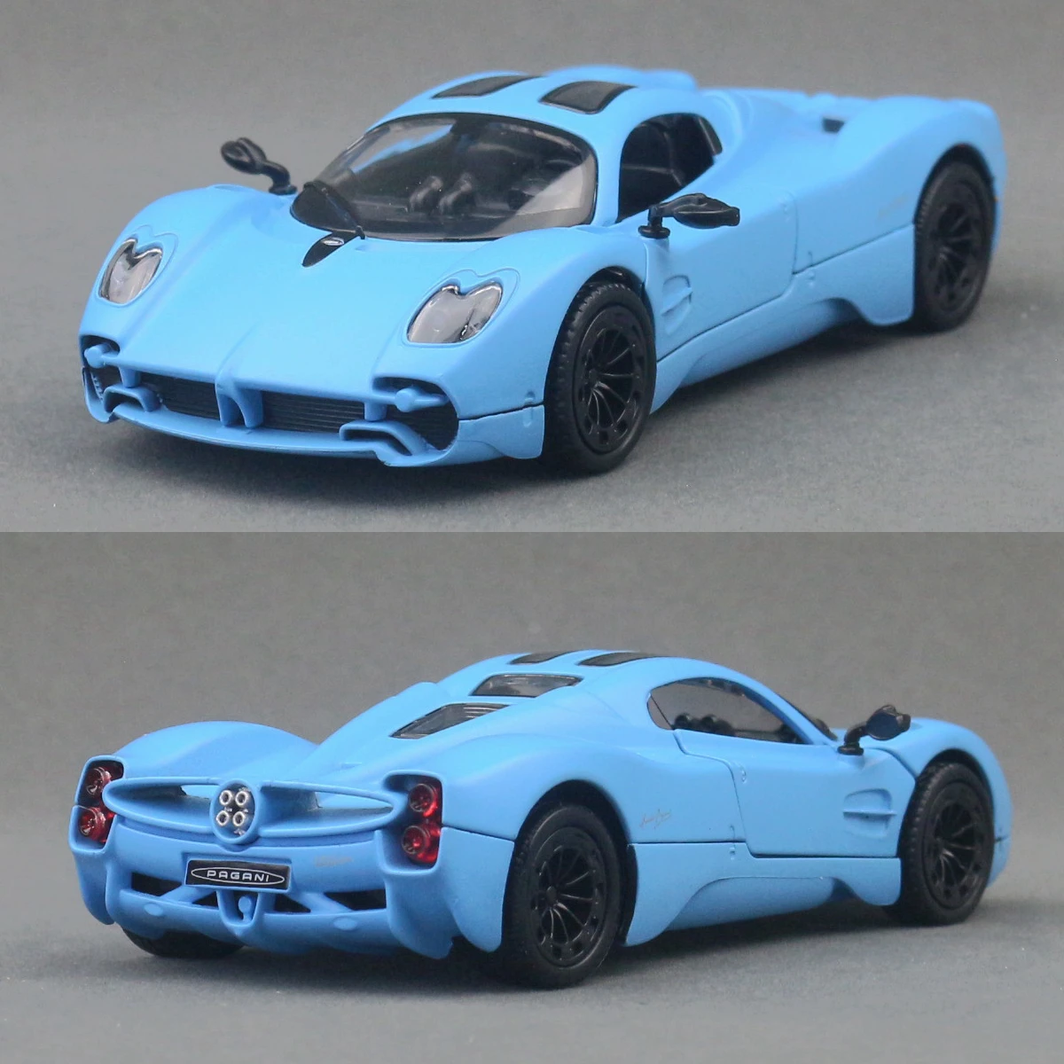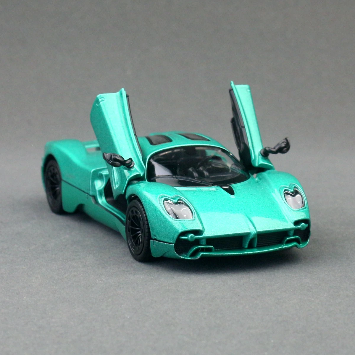 Step into the world of high-performance automobiles with this meticulously crafted 1:38 scale diecast model of the Pagani Utopia Super Sport. Finished in a dazzling metallic turquoise, this model captures the sleek, aerodynamic design of the original with stunning detail. The glossy, smooth surface reflects light beautifully, emphasizing its sharp contours, low-profile stance, and dynamic curves. The front features authentic, clear headlight lenses and subtle air intakes, while the side profile showcases molded air vents and intricately designed black multi-spoked wheels with textured rubber tires. The rear end concludes the look with rounded lines, a small integrated spoiler, and molded taillights. This collectible exudes realism and elegance, perfect for enthusiasts and collectors alike.