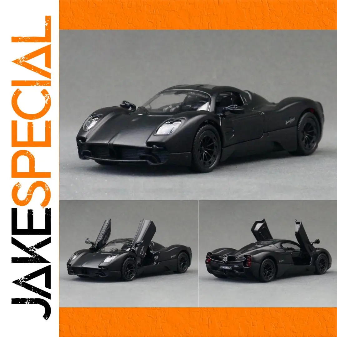 The 1:36 scale diecast model of the Pagani Utopia Supercar is an impressive collectible, finished in a sleek matte black color. Its low, aerodynamic profile and aggressive design feature distinctive curves, stylized headlights, and a prominent grille. The model showcases functioning doors that open upwards, revealing an intricately detailed interior with realistic seats and dashboard elements. Fitted with sporty black wheels, this alloy and plastic construction captures the essence of high-performance vehicles. Immerse yourself in the artistry and craftsmanship of this stunning supercar model, perfect for any enthusiast to display or enjoy.