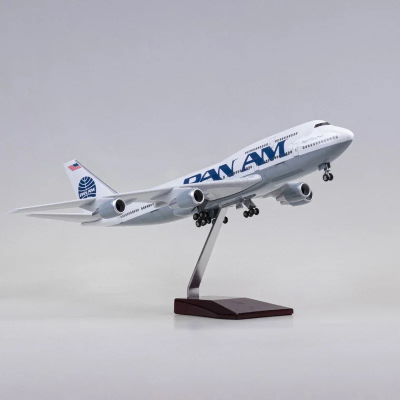 This 1/150 scale diecast resin model of a Boeing 747 aircraft, measuring 47 cm in length, showcases the vintage PAN AM airline design with a sleek white fuselage, bold blue “PAN AM” lettering, and a tail fin featuring a globe emblem and American flag. Available with or without a LED light that glows for about 20 seconds per recharge, it includes both landing gear and a display stand for a realistic presentation. Crafted from alloy and resin, this detailed collectible is perfect for home, office, bar, or desk decor, highlighting precise branding and proportions. Suitable for ages 14 and over, with minor paint wear typical of collectible models.