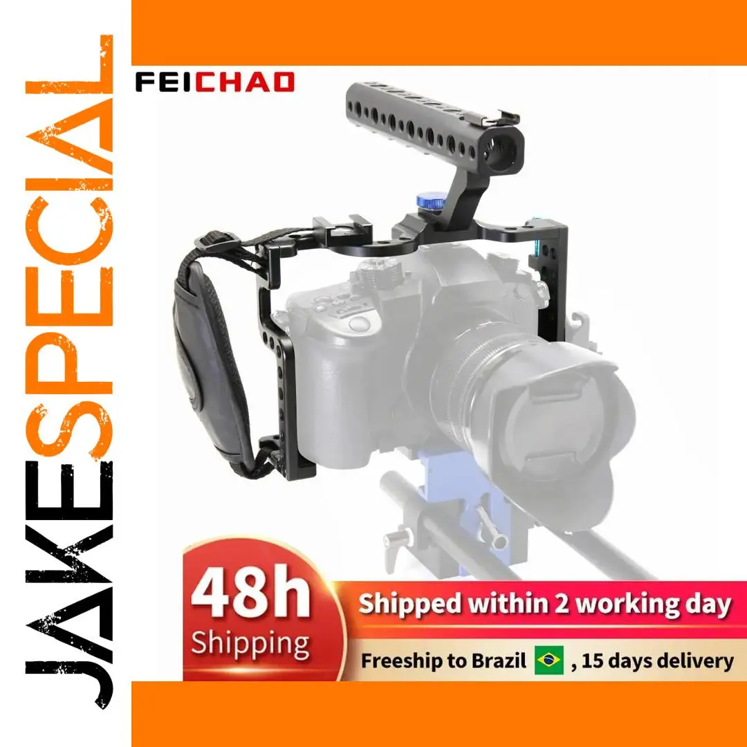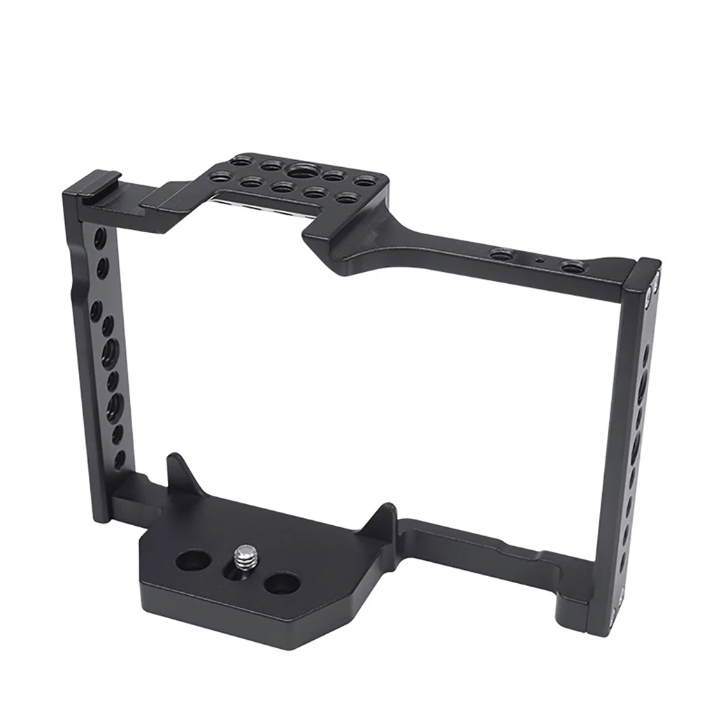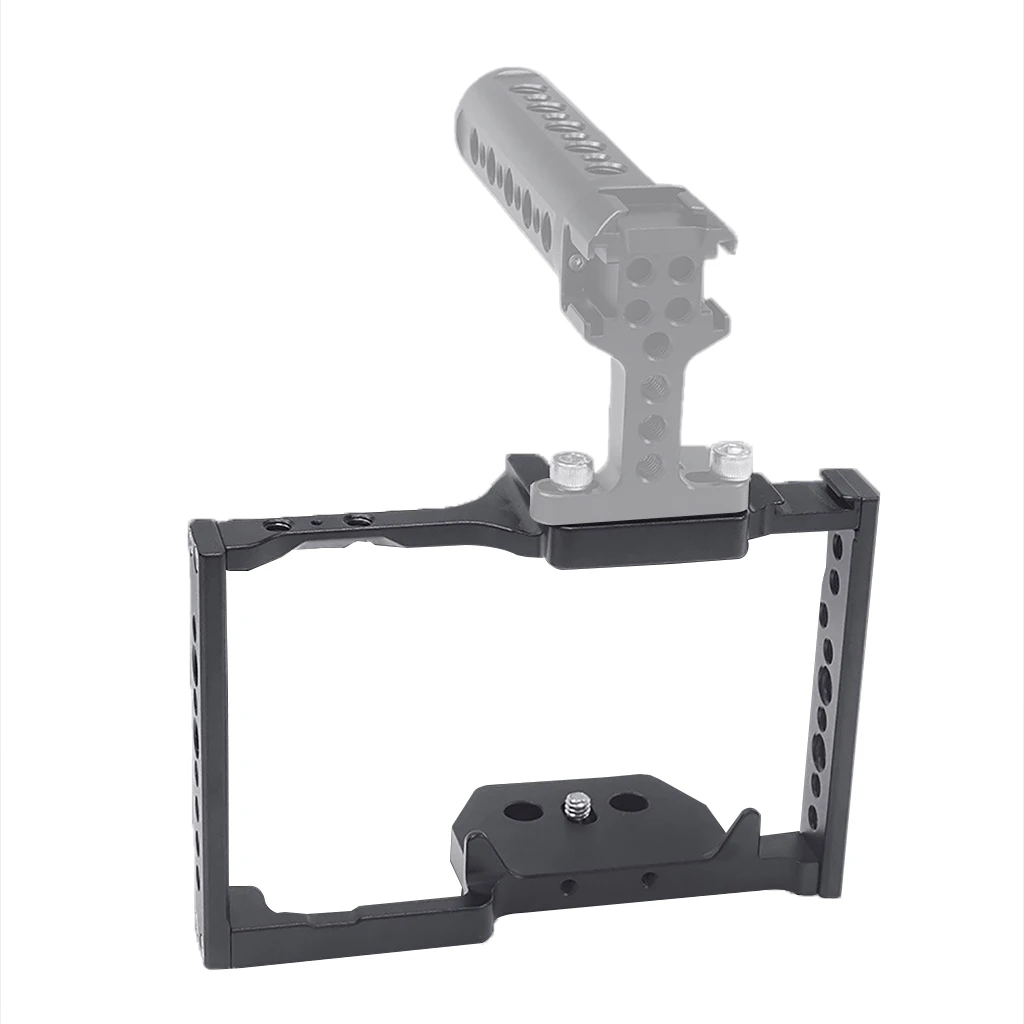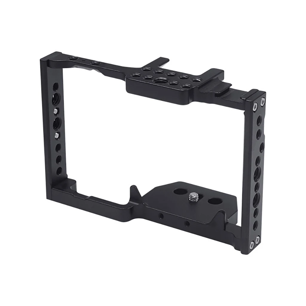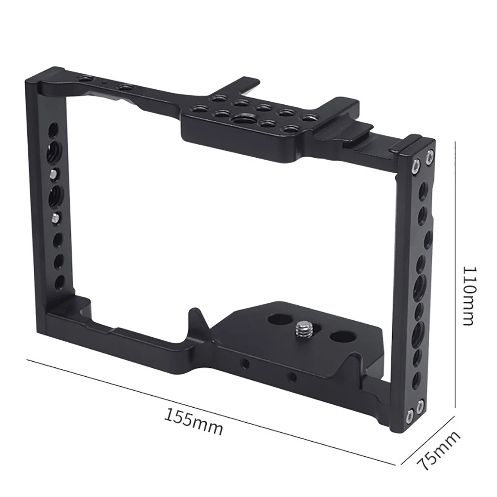 Enhance your video setup with this black aluminum alloy camera cage, precisely designed for Panasonic Lumix GH4, GH5, and GH5S cameras. Measuring 155mm x 75mm x 110mm and weighing just 190 grams, it offers seamless access to all buttons and screen flips. Equipped with multiple 1/4″ and 3/8″ threaded holes, cold shoe mounts, and a HDMI cable saver design, it provides versatile accessory attachment options. The included top handle grip and hand strap facilitate low-angle and handheld shooting styles, while its support for a rod system allows further expansion. Its sleek, compact design merges practicality with a minimalist industrial aesthetic, ideal for professional videographers.