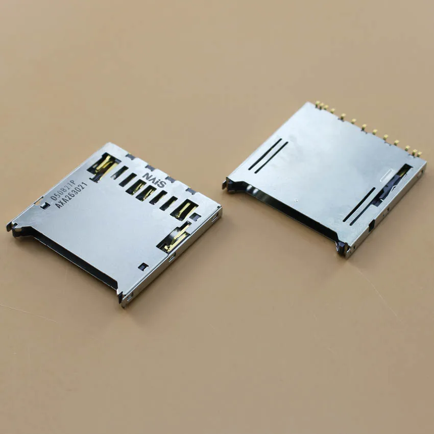 This SD memory card connector socket features a sleek, metallic silver-colored exterior with a matte finish, designed for Panasonic devices requiring a 13-pin interface. The compact connector includes a flat rectangular metal shell with subtly rounded edges, engraved markings such as “ka-267,” “NAS,” and batch codes like “50583ZP” and “AXA26302.” It features precise gold-plated pins for reliable electrical contact, arranged along the top and bottom edges, with notches and slit openings for secure installation. Crafted for durability and high performance, this connector seamlessly integrates into electronic devices needing SD card support, combining a professional minimalist design with technical precision.