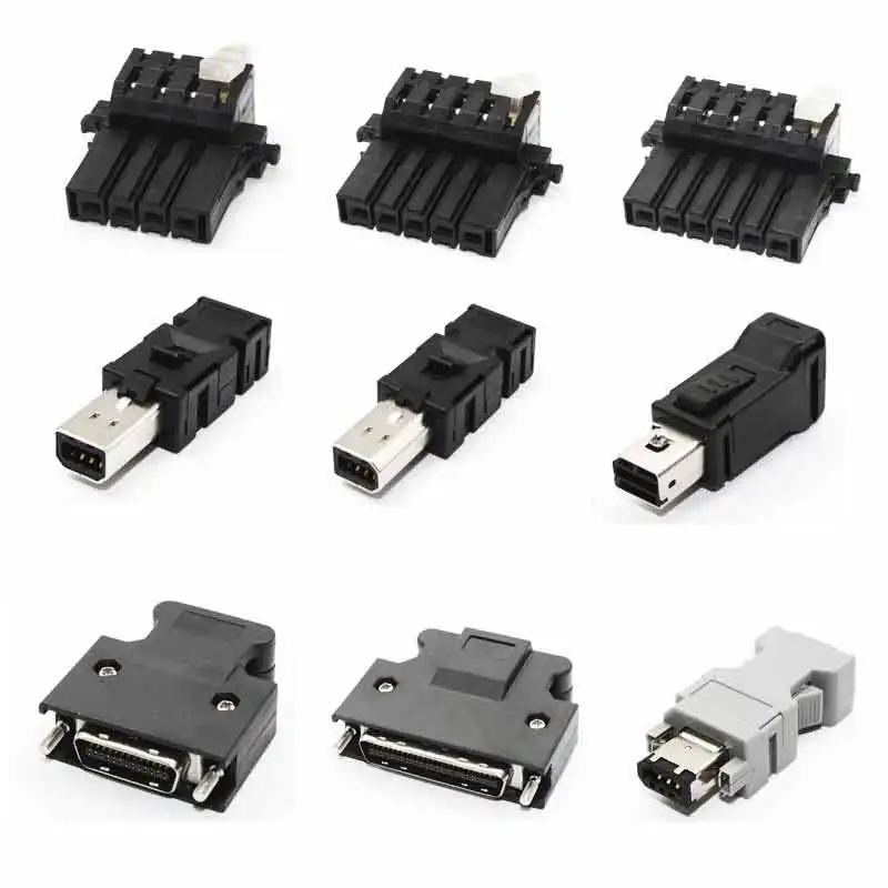 Experience seamless connections with this versatile Panasonic servo drive plug set, designed for professional automation setups. Crafted with precision, these connectors feature a sleek black plastic housing combined with durable metallic components, such as polished and matte finishes on BNC-like and Ethernet connectors. The collection includes a variety of configurations, from 2-pin to 9-pin male and female connectors, to suit different Panasonic models and applications. Whether you need a compact terminal for encoder motors or a robust I/O interface, these plugs ensure reliable signal transmission and secure connections. Their modern, industrial aesthetic emphasizes high-tech efficiency, making installation straightforward and dependable for your automation needs.
