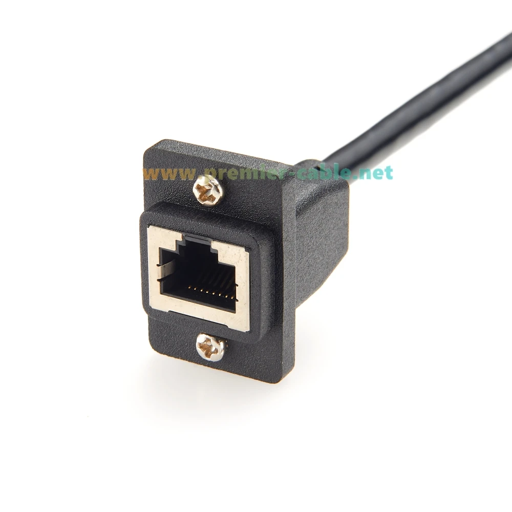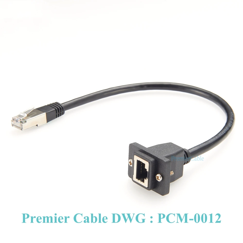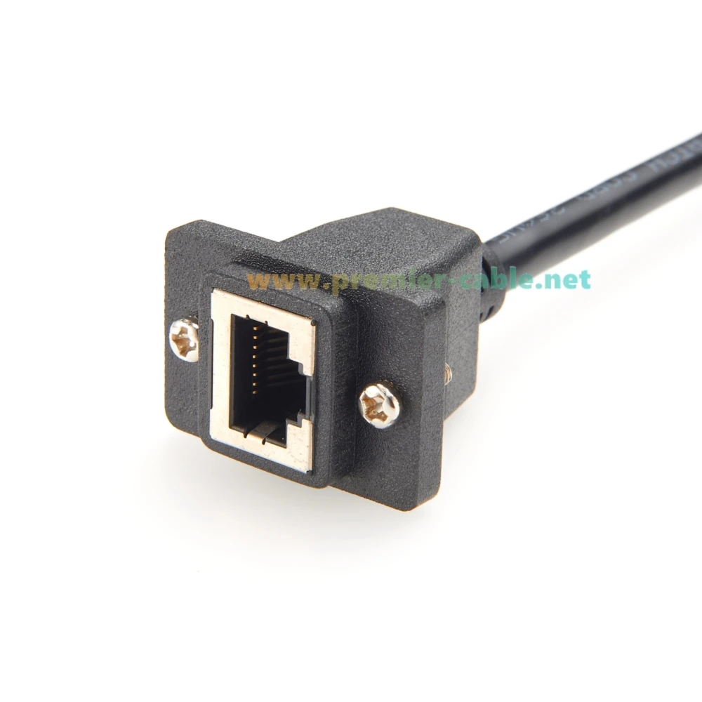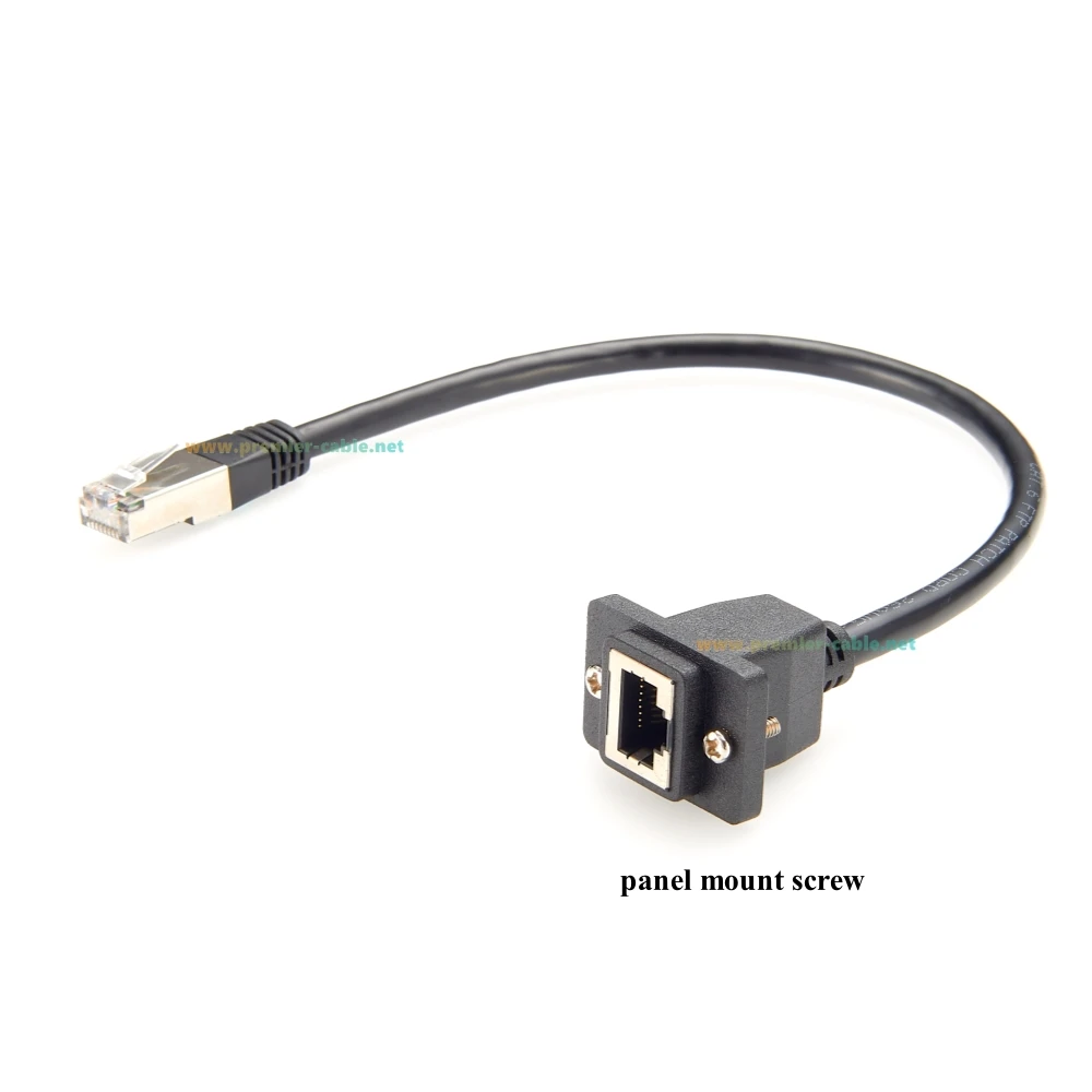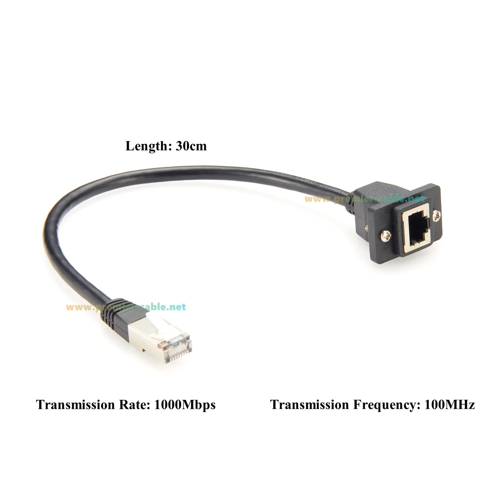Experience seamless network connectivity with this high-quality 30cm RJ45 Cat5e Ethernet extension cable designed for secure panel mounting. Its sleek black outer jacket combines durability with a professional appearance, ideal for both indoor and outdoor installations. The female connector features a textured rectangular body framed with light-colored plastic, mounting firmly onto panels with two screws for a secure, industrial look. On the opposite end, the transparent male connector reveals gold-plated contacts for optimal data transmission and includes a locking tab for secure connections. Whether you're setting up home, office, or data center networks, this cable ensures organized, reliable connections with a clean aesthetic that complements professional environments.
