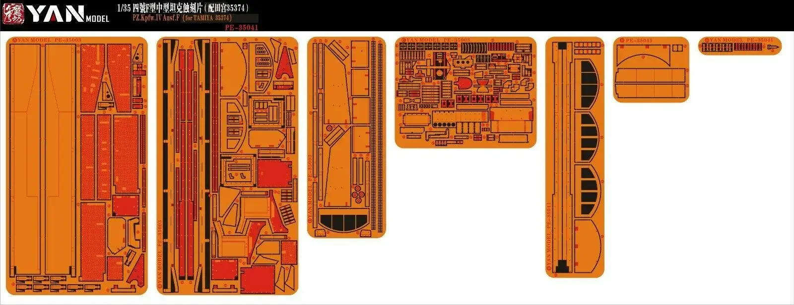 Enhance your 1/35 scale Panzer IV Ausf.F model with this meticulously crafted upgrade set from Yan Model. Designed specifically for the Tamiya 35374 kit, this detailed set features finely etched photo-etched metal parts that add realism and precision to your model. The components include handrails, brackets, armor details, and tools, all crafted with delicate etching to perfectly replicate authentic military equipment. The set also includes miniature figures, dressed in detailed military uniforms and helmets, bringing your model to life with a disciplined, utilitarian aesthetic. With its realistic metallic gold highlights and intricate parts, this upgrade will elevate your modeling experience and achieve a highly authentic appearance.
