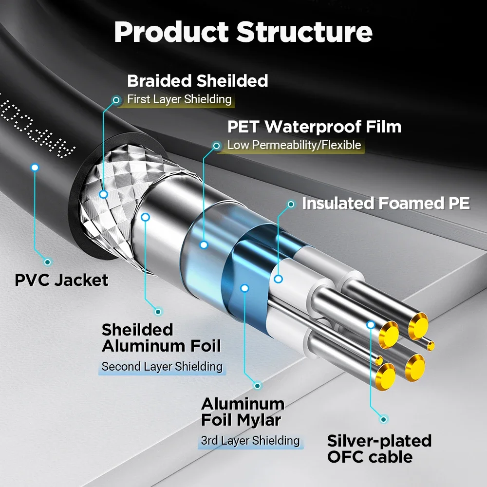 - Features multi-layer shielding including braided, foil, waterproof PET film, and PE foam insulation for maximum EMI/EMC performance.