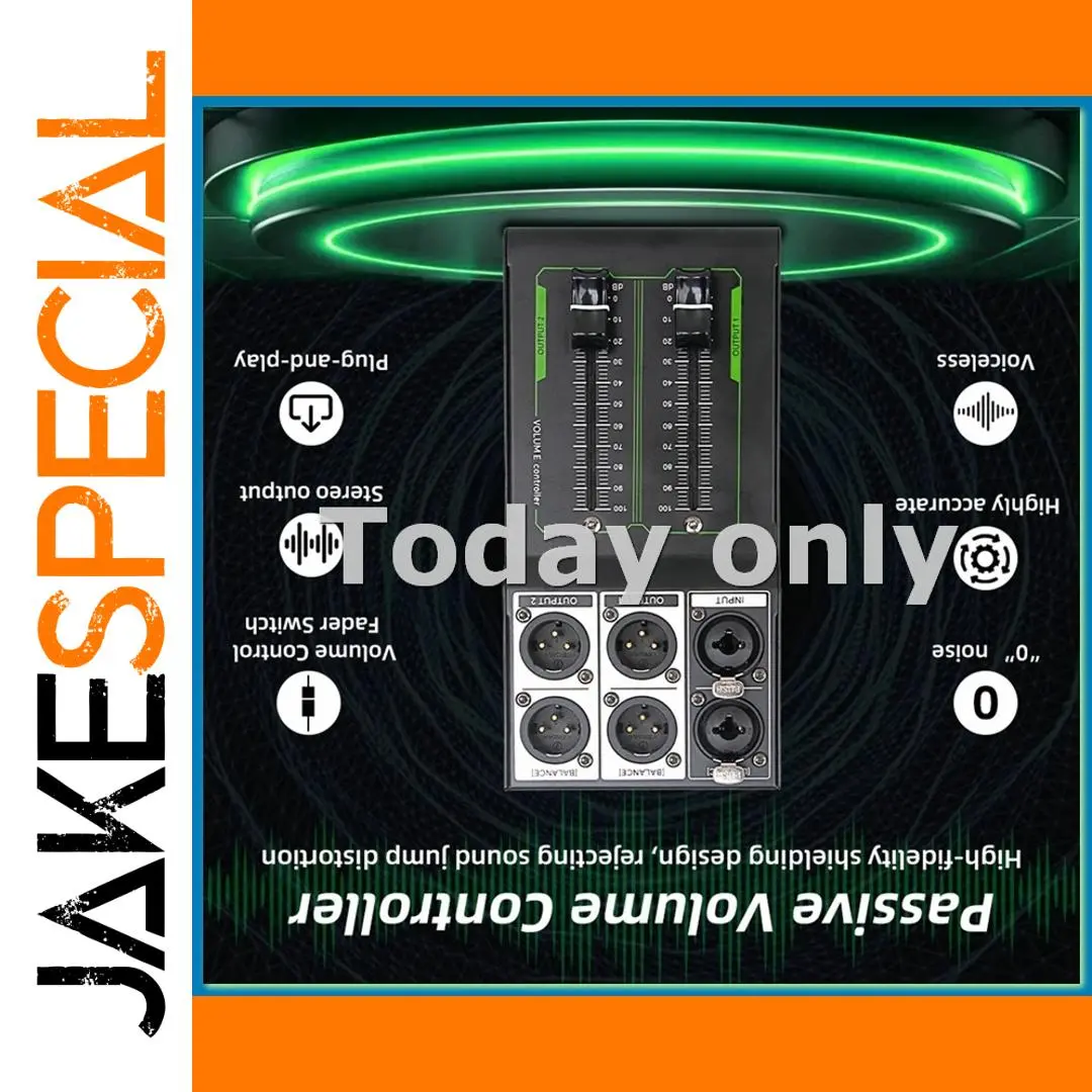 Experience seamless audio control with this passive volume controller, designed for audiophiles and professionals alike. Crafted from durable aluminum alloy, it features a sleek black finish that complements any studio or live setup. Its intuitive design includes two vertical sliders with white handles, providing precise volume adjustments for different audio channels. The green accents along the sliders add a modern touch, making it easy to operate at a glance. Supporting a wide input frequency range of 10Hz to 100kHz, this device ensures lossless sound quality with no noise or signal degradation, making your music, recordings, and performances crystal-clear. With plug-and-play compatibility, it’s ideal for enhancing your sound system without the need for external power. Elevate your audio experience today.
