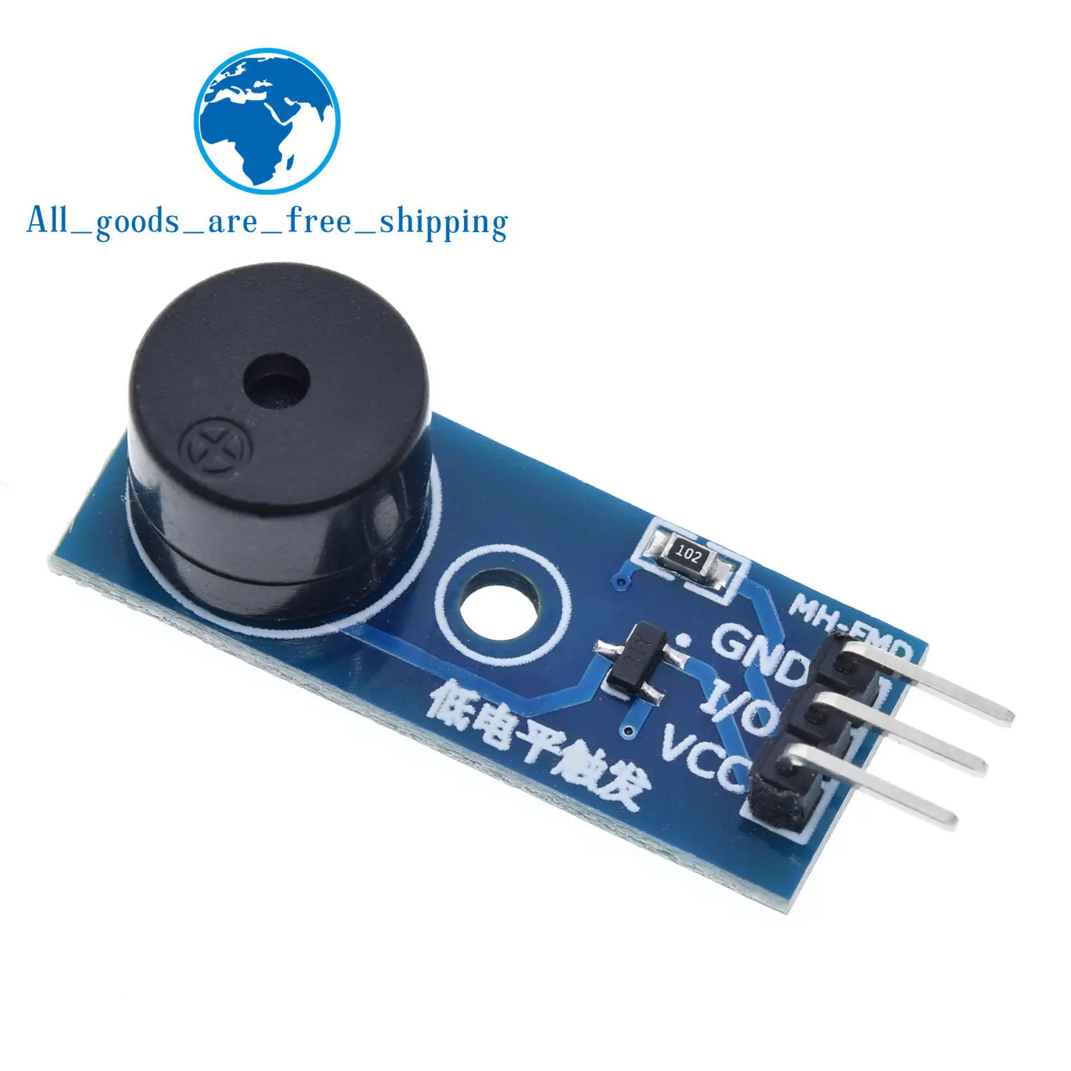 Experience reliable performance with this high-quality passive buzzer module, available in packs of 1 or 10 units, designed for DIY electronics projects. Featuring a compact blue rectangular PCB with white silkscreen markings, it showcases a sleek, modern appearance. The module includes a smooth, black cylindrical passive buzzer mounted vertically, with a slightly raised circular top. Shiny metallic pins extend from the side for secure connections, complemented by small surface-mounted resistors and diodes that add technical detail to its precise design. Ideal for switch and sensor applications with STM microcontrollers, this versatile module offers safety, durability, and easy integration for your electronic projects.