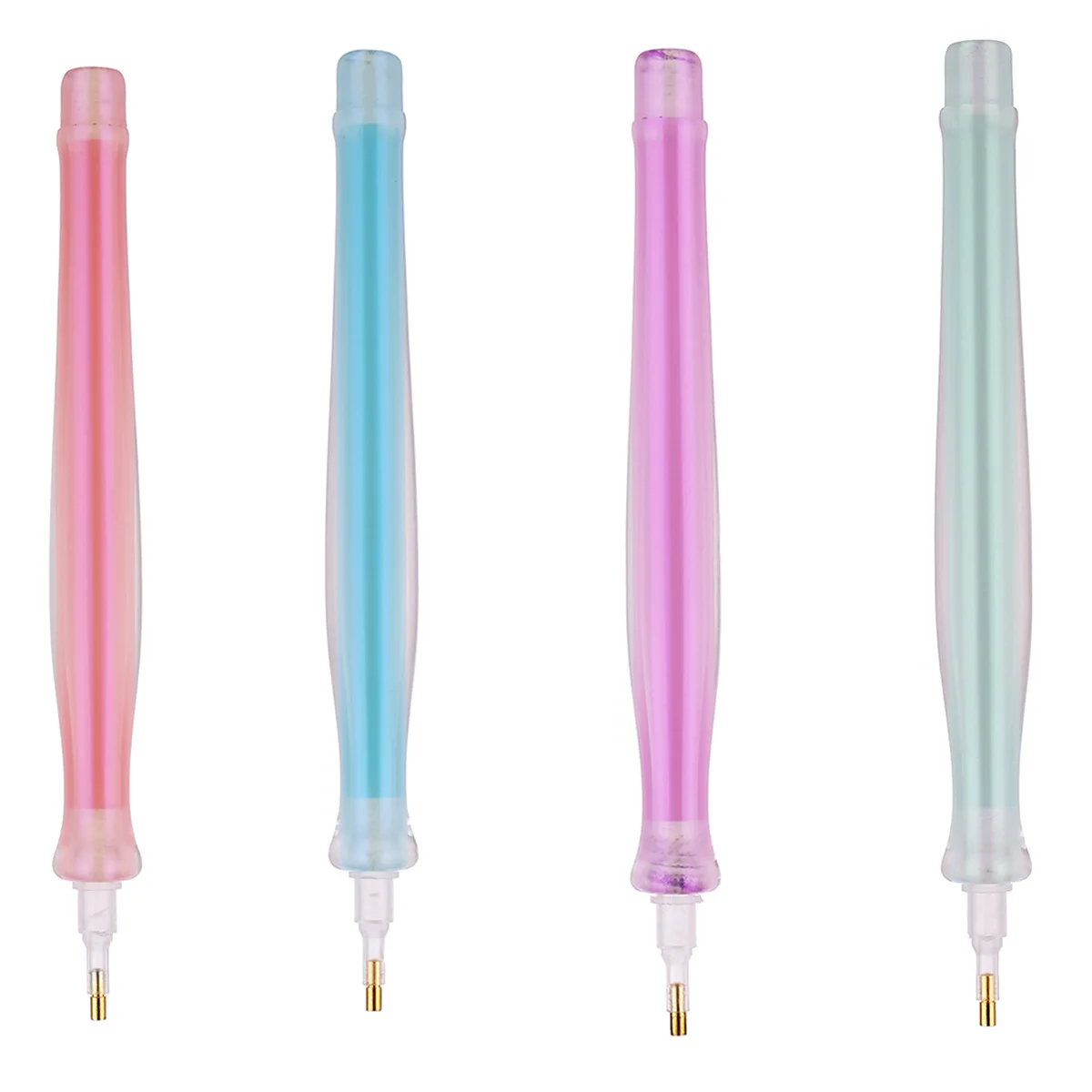 Transform your craft experience with this beautifully crafted diamond painting pen kit, designed for precision and comfort. The set features four elongated, pastel-colored resin pens, each measuring 14 centimeters long with a glossy, smooth finish. These pens display calming gradient tones of pink, blue, purple, and light green, perfect for creating a serene workspace. The transparent resin pen heads clearly show the internal slots that securely hold tiny round diamonds, facilitating precise placement. The metal connectors allow for easy attachment of replacement heads, offering versatility. Included accessories like a textured metal roller, diamond painting glue, and a plastic mat make this set an all-in-one solution for your diamond art projects. Enjoy an organized, elegant crafting experience with this sophisticated kit.