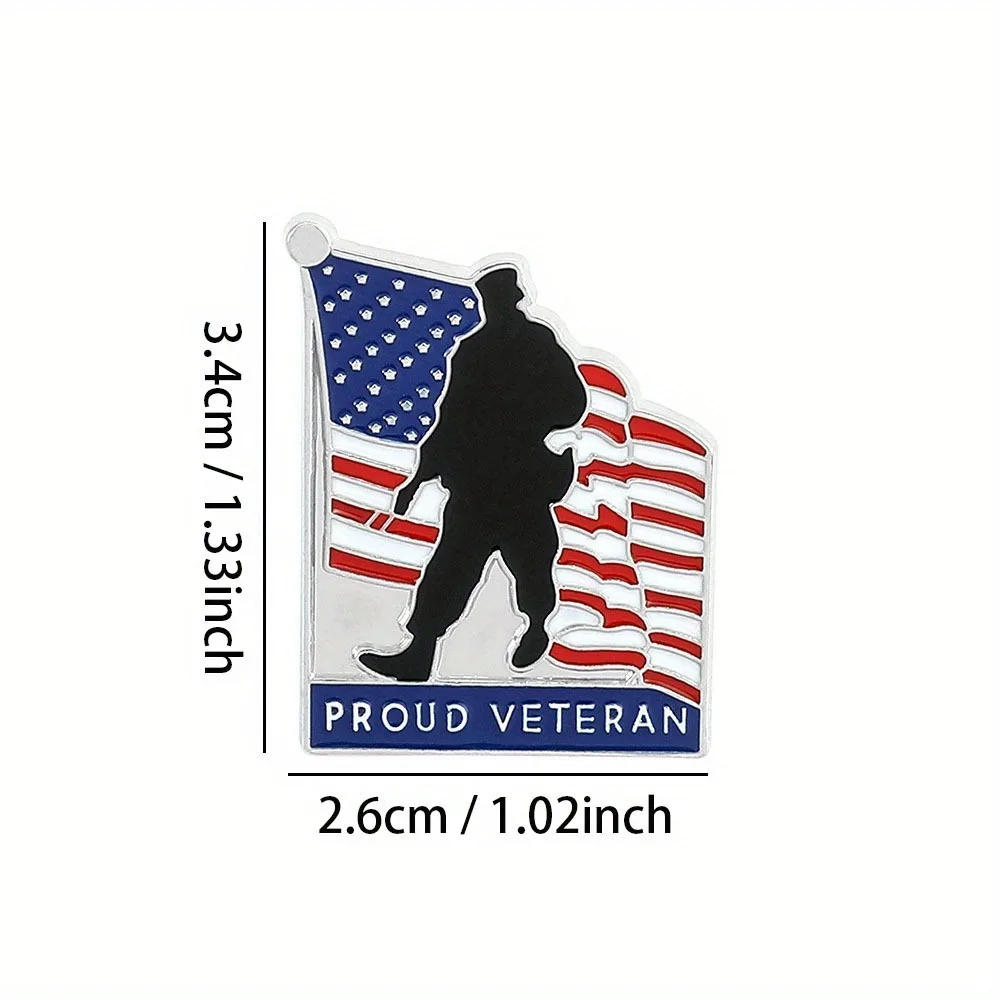 Discover this exceptional patriotic US Veteran lapel pin, crafted from high-quality alloy with a shiny metallic finish. Measuring 3.4 centimeters in height and 2.6 centimeters in width, this badge weighs around 8 grams, making it a perfect accessory for showcasing pride and respect. Its rectangular shape with a slightly irregular outline adds visual interest. The central silhouette depicts a soldier in a combat stance, highlighted in bold black for striking contrast. Behind the figure, an American flag motif features a blue canton with white stars and vibrant red and white stripes, symbolizing patriotism. The bottom blue section displays “PROUD VETERAN” in white uppercase letters, completing a respectful memorial design. Its durable, polished metal construction makes it ideal for casual wear, gifting, cosplay, or performances, perfect for honoring service members.