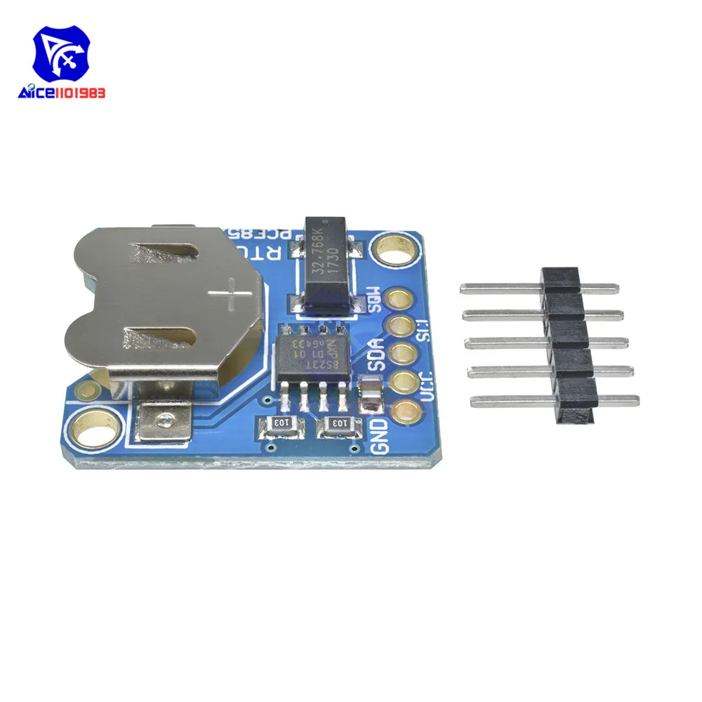 This PCF8523 RTC breakout module features a compact blue PCB with white silkscreen markings, pin headers, and a silver cell socket designed for a CR1220 battery (not included). Operating at 3.3V or 5V, it supports applications like data logging, clock creation, timestamping, timers, and alarms. The module can keep accurate time for over five years, with a typical drift of up to 2 seconds per day, ensuring reliable performance. Its sturdy, assembled design with clearly labeled pins offers easy operation and durable construction, making it ideal for integration into various electronic projects requiring dependable real-time clock functionality across temperature ranges from -20°C to 65°C.