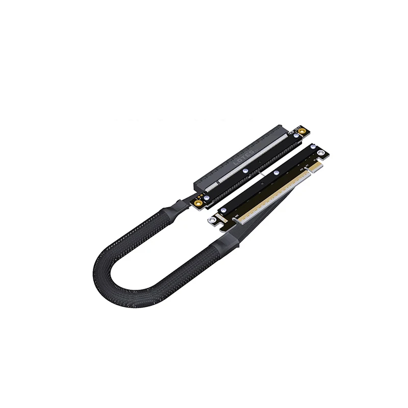 Experience the ultimate in high-performance connectivity with this premium PCIe 5.0 x16 GEN5 extension cable. Designed for advanced graphics setups, it ensures ultra-fast data transfer rates of up to 512Gbps. Its sleek black flat sheath provides excellent flexibility and durability, making installation straightforward even in tight spaces. The gold-plated contacts guarantee optimal conductivity and corrosion resistance, while the metallic EMI-shielding layer significantly reduces electromagnetic interference. Reinforced with 2mm-thick aluminum alloy spacers, this cable offers exceptional robustness against pulling and interference. Available in customizable lengths from 20 to 60 centimeters, with options including 25cm and 30cm, it is ideal for high-end NVIDIA RTX 50 series or AMD RX 90xx series graphics cards. Its high-quality construction provides long-lasting, stable performance under demanding conditions.