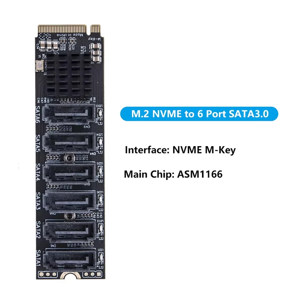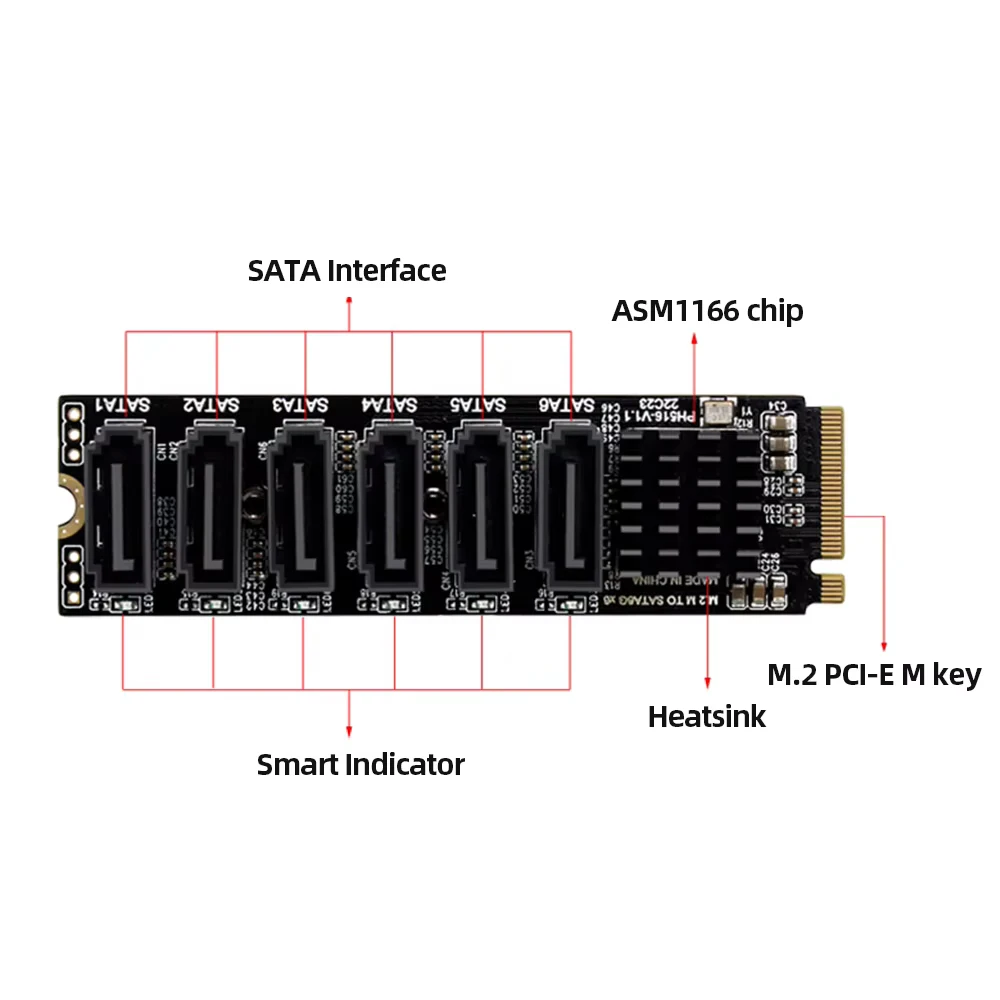 - This PCIe riser card converts an M.2 NVMe slot into 5 or 6 SATA ports, expanding your connection options for multiple storage devices in a compact, efficient design.