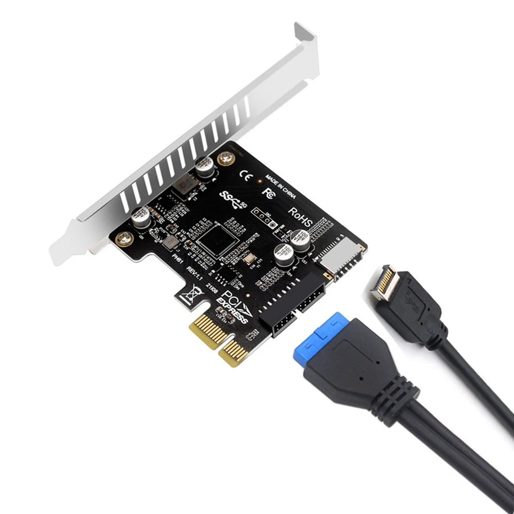 Imagine enhancing your computer’s connectivity with this sleek PCIe to USB 3.0 expansion card. Its modern black circuit board with a matte finish exudes a professional look, complemented by a bright gold-plated edge connector that guarantees reliable performance. The sturdy silver ventilation-cut metal bracket ensures durability while providing efficient airflow. Equipped with a 19-pin to 20-pin Type-C mount adapter, it extends your front panel USB Type-C ports, allowing quick, effortless device connections. This versatile upgrade seamlessly supports PCIe x1, x4, x8, or x16 slots, delivering transfer speeds up to 5Gbps. Compatible with various Windows OS versions, it offers a robust, reliable way to expand your system's USB capabilities with a clean, minimalist aesthetic.